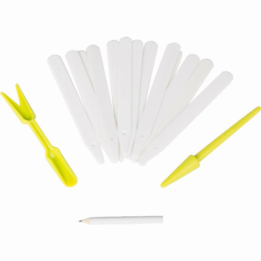 Количество в наборе — 25 шт. Набор ярлыков высотой 15см с карандашом, садовой вилкой и посадочным конусом используется в качестве информационных табличек при посадочных работах. Ярлыки применяются для обозначения наименования и сорта рассады, вилка — для пикировки, конус — для посадки семян.