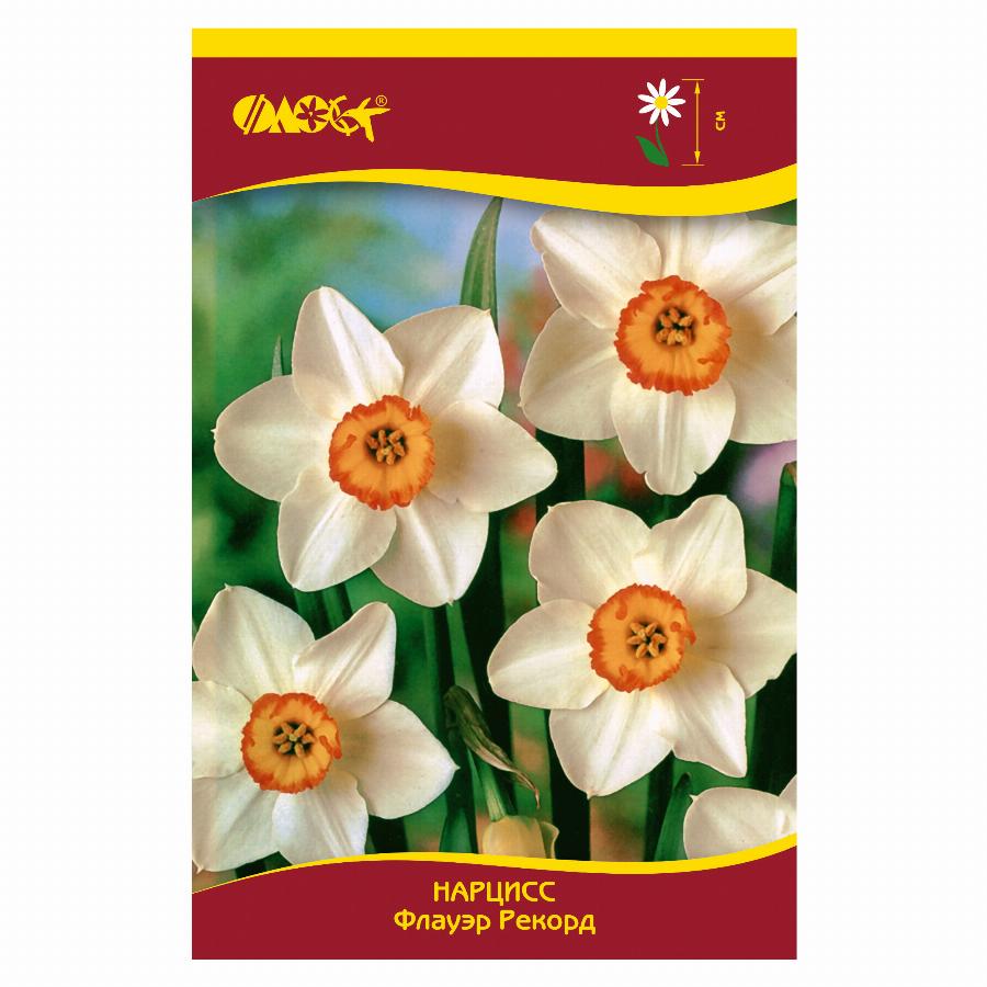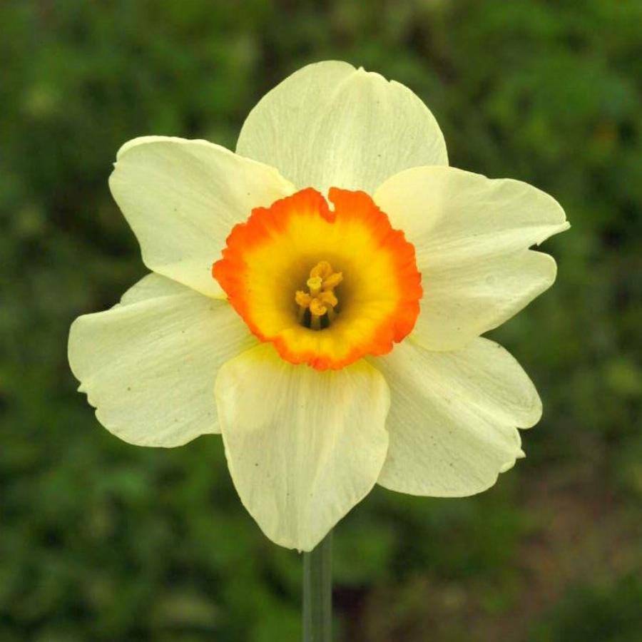 Крупнокорончатый Нарцисс. Цветок крупный с нежным ароматом. Доли околоцветника белые с легким желтоватым налетом, округлые; коронка ярко-желтая, плоская, с яркой оранжево-красной гофрированной каймой.