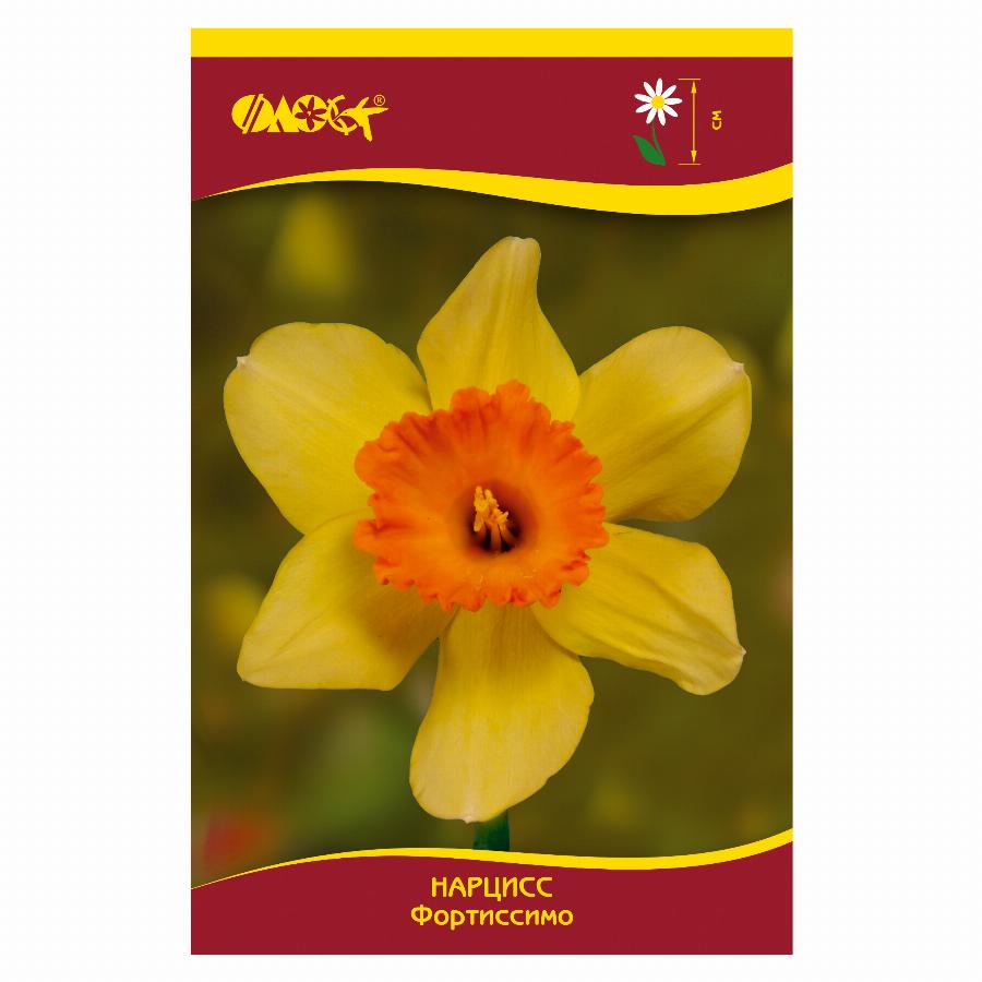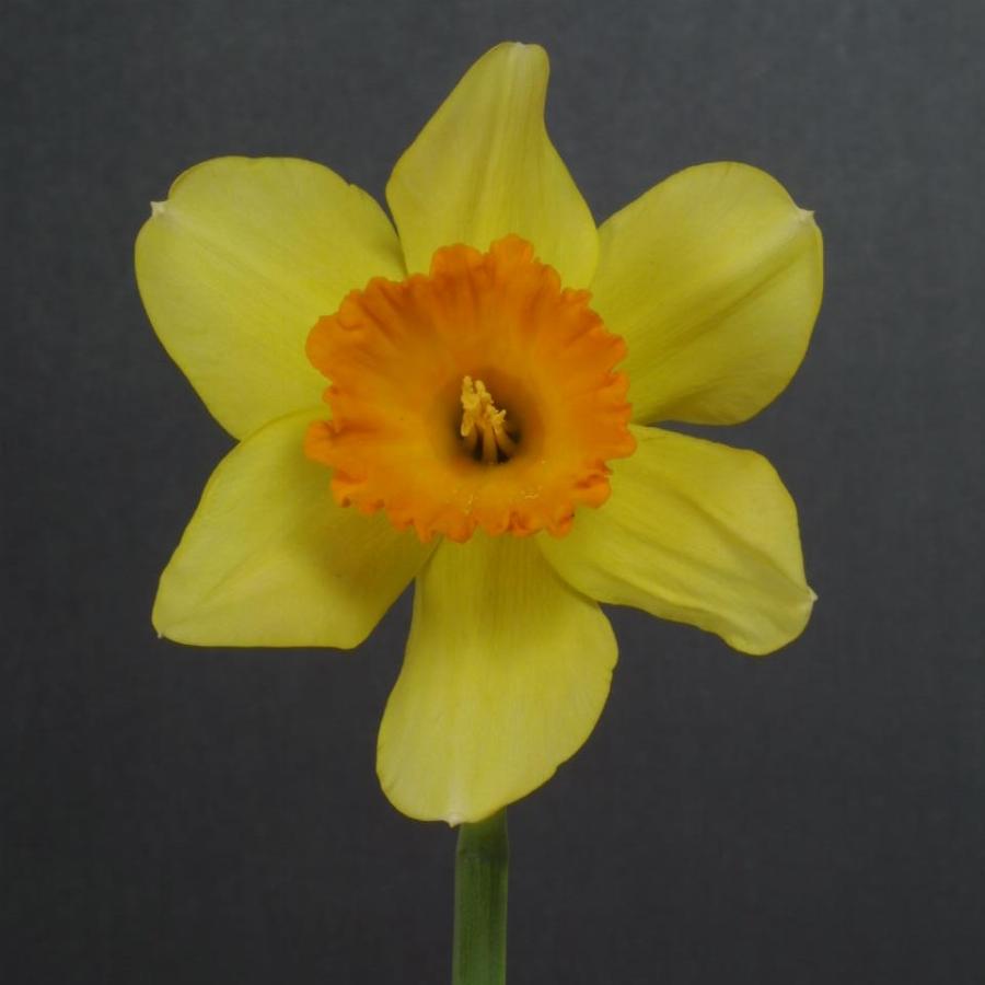 Крупнокорончатый нарцисс. Цветок крупный, яркий, блестящий, желтый. Красиво изрезанная коронка-настурциево-оранжевая, более яркая к краю, насыщенно- красная. Стебель высокий и прочный.