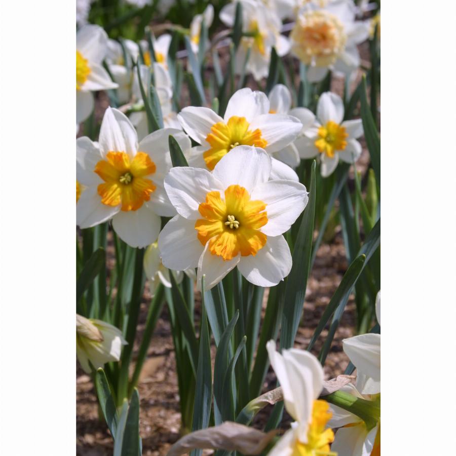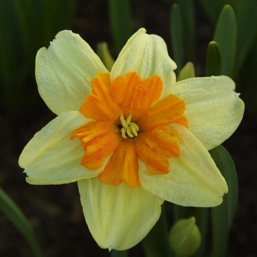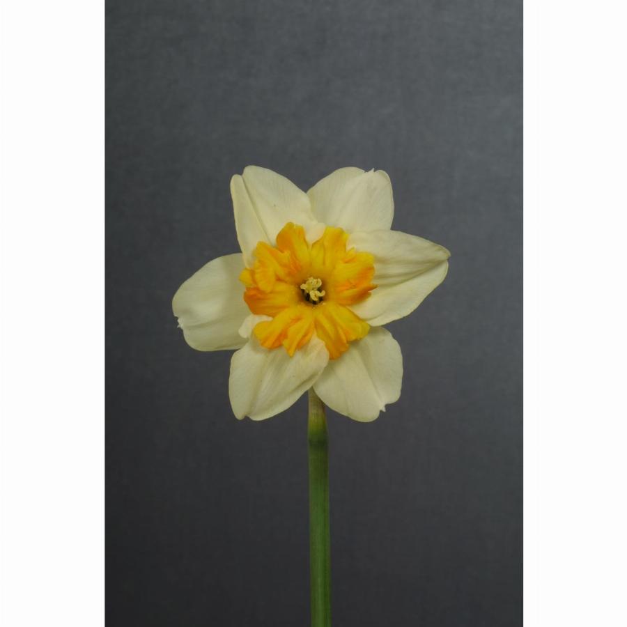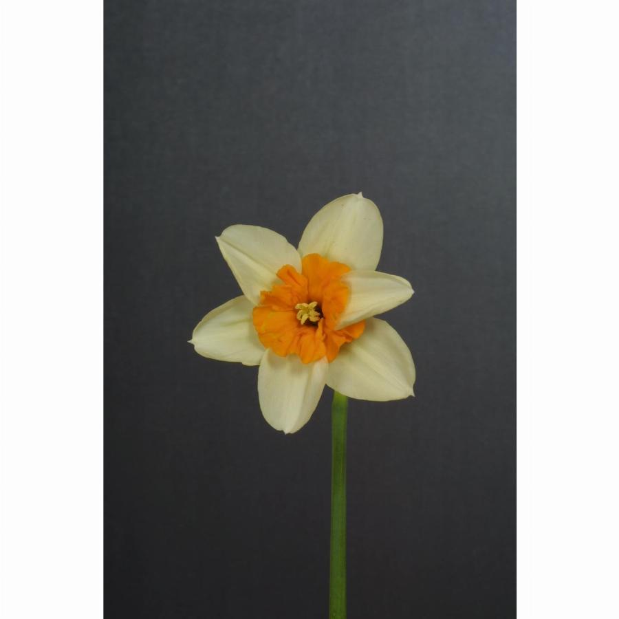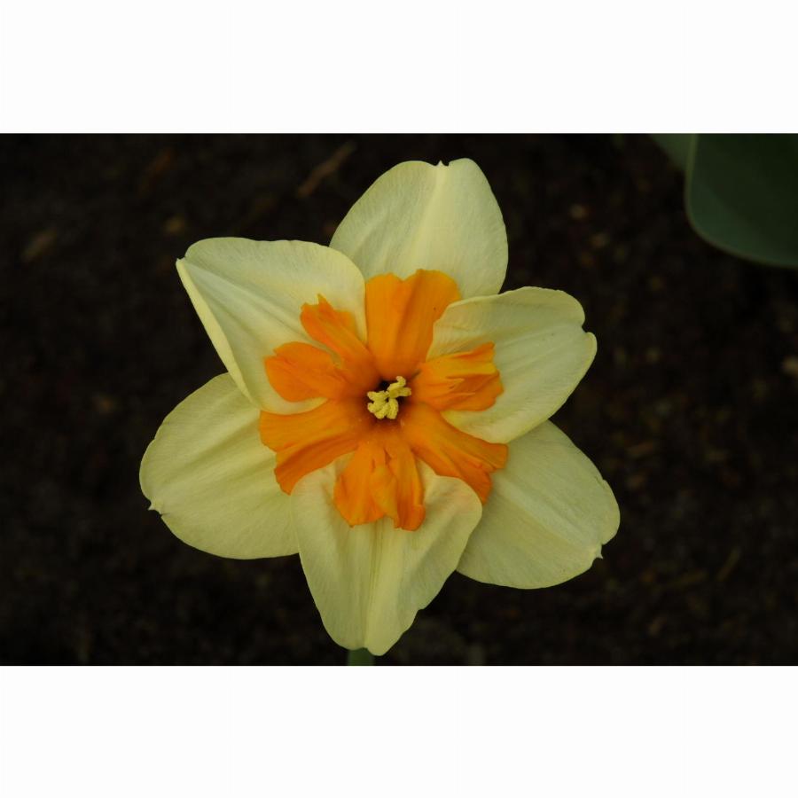 Нарцисс с разрезанной коронкой. На фоне нежно-белых долей околоцветника ярко выделяются глубоко разрезаная, орнжево-красная коронка, совершенно плоская, прилегающая к венчику. Цветок на длинных прочных цветоносах. Сорт оправдывает свое название «Парижанка».
