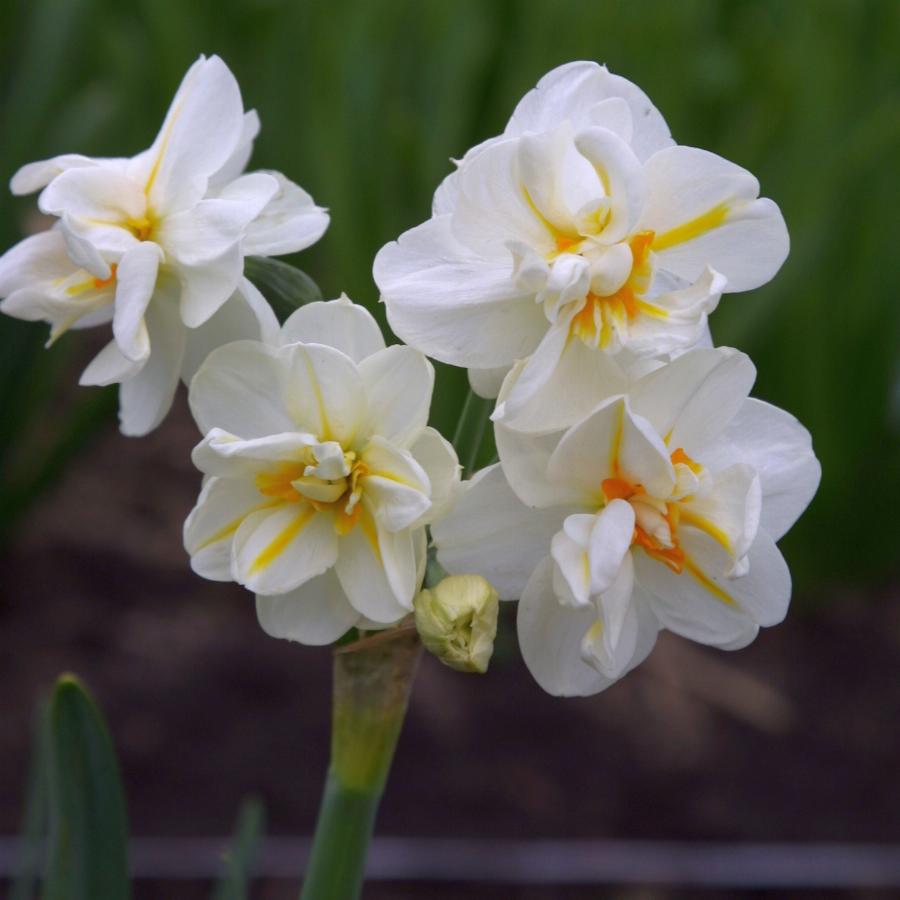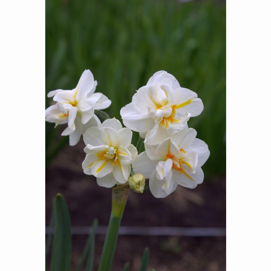 Высота растения 35 см, цветок кремово-белый с астровидной оранжевой серединой, ароматный, многоцветковый.