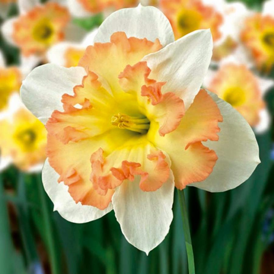 Окраска цветка: околоцветник – белый, привенчик — желтый с абрикосово-розовой каймой. Высокие цветоносы делают сорт пригодным для срезки. Предпочитает открытые, хорошо освещенные пространства. (Крупнокорончатый). Высота растения 35 см. Цветение апрель