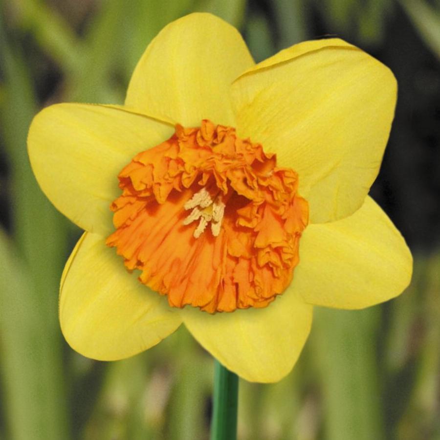 Крупнокорончатые нарциссы. Цветок крупный, бриллиантово-желтый с лимонным оттенком. Коронка крупная, широко воронковидная, сильно гофрированная, по краю интенсивно оранжевая. Диаметр цветка 9,5-10 см. Высота растения 50-60 см. Цветет в средние сроки.