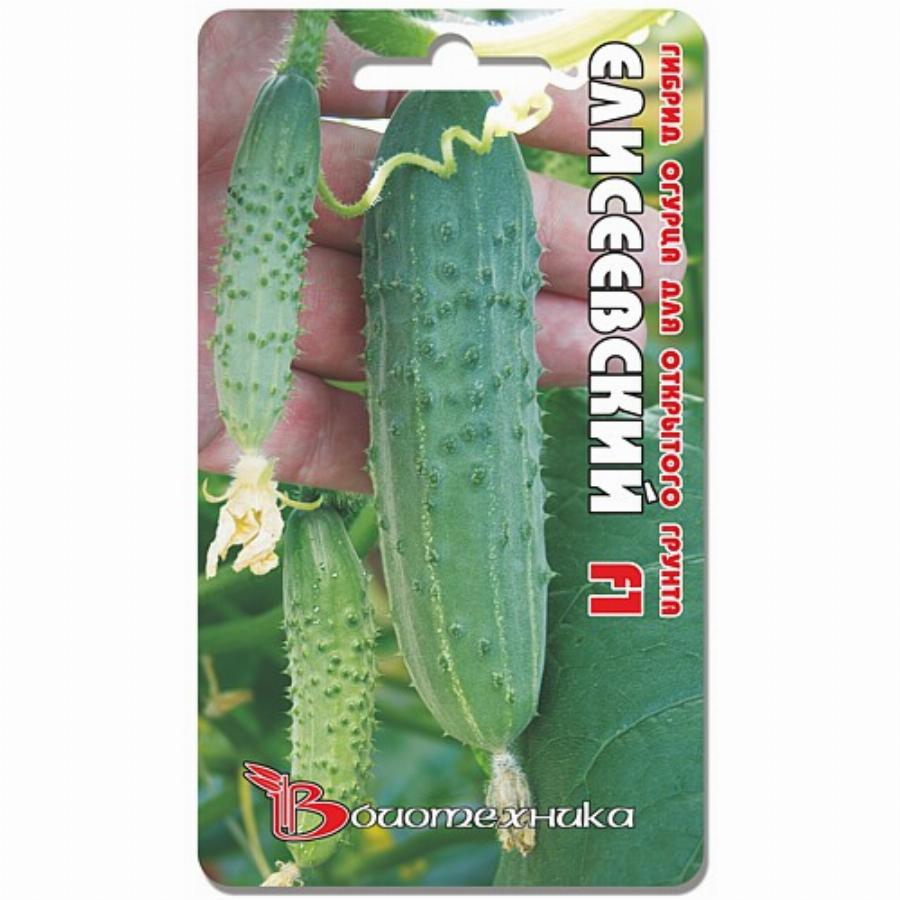 Гибрид Елисеевский среднеспелый — от всходов до первых сборов — 55-57 дней, пчелоопыляемый. Растение индетерминантное, среднерослое, сильноветвистое, смешанного типа цветения. Лист крупный, темно-зеленый. Зеленец цилиндрический, зеленый, с белесыми полосами доходящими до 1/3 длины плода и слабо выраженной мраморностью, крупнобугорчатый, шипы белые. Длина товарного плода 10-11 см, диаметр 3-3,2 см. Кожица плода жесткая, консистенция мякоти плотная, хрустящая. Толерантен к ложной мучнистой росе. Обладает длительным периодом плодоношения. Для регионов с прохладным климатом необходим рассадный способ выращивания. Семена высевают в торфяные горшочки диаметром 10 см со специально подготовленной почвой (2 части перегноя, 1 часть дерновой земли, 1 часть песка), на глубину 1,5 см. Температура воздуха и почвы должна быть 20-23°С. Грунт должен быть равномерно увлажнен (не допускается перелив и закисание почвы). После появления всходов, в процессе роста растений, не допускать снижение температуры ниже 14°С. Сделать 1-2 подкормки полным минеральным удобрением с преобладанием азота. Рассада высаживается, когда минует угроза заморозков. Гибрид предназначен для выращивания в открытом грунте и пленочных тоннелях без подвязки к шпалере и без формирования растения. Пригоден для так называемого бочкового посола (кстати, считавшегося на Руси самым вкусным). Предъявляет минимальные требования к уходу и имеет высокую устойчивость к неблагоприятным погодным условиям, толерантен к ложной мучнистой росе.