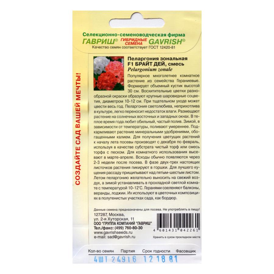 ПЕЛАРГОНИЯ ЗОНАЛЬНАЯ БРАЙТ ДЕЙ F1 4 ШТ гавриш