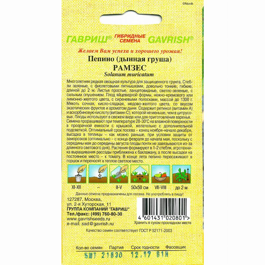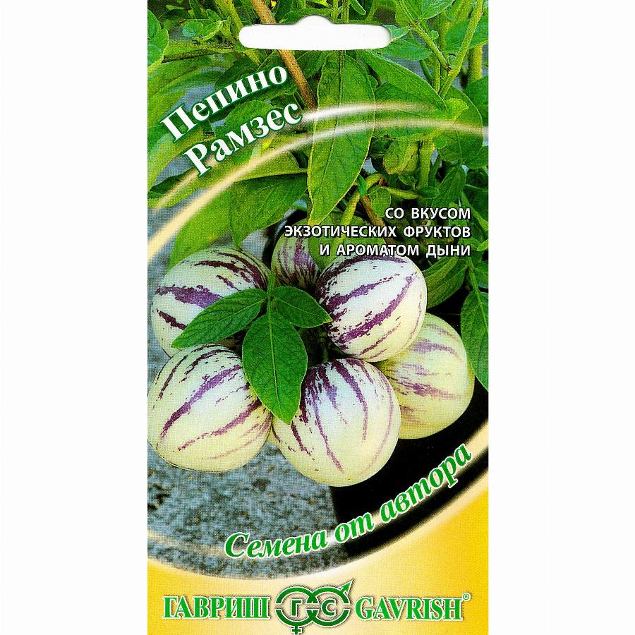 Многолетняя редкая овощная культура для защищенного грунта. Стебли зеленые с фиолетовыми пятнышками, довольно тонкие, гибкие, длиной до 2 м. Листья простые, ланцетовидные, светло-зеленые, с сильным опушением. Плод яйцевидной формы, нежно-кремового или лимонно-желтого цвета, с сиреневыми полосками, массой до 1300 г. Мякоть сочная, кисло-сладкая, медово-желтого цвета со вкусом экзотических фруктов и ароматом дыни. Содержит ретинол (витамин А) и аскорбиновую кислоту (витамин С), которой не меньше, чем в цитрусовых. Плоды используют в свежем виде или для приготовления варенья. Семена проращивают при температуре 28-30 градусов на влажной поверхности в прозрачной емкости с крышкой, желательно с дополнительной подсветкой. Оптимальный срок посева — конец ноября — начало декабря, высадка в теплицы — как можно раньше, при условии защиты от заморозков (оптимально — с конца февраля до начала мая, поскольку с середины мая до середины августа плоды почти не завязываются из-за длинного светового дня). Растения формируют в 1-2 стебля, агротехника выращивания рассады приближена к баклажану, а после высадки на постоянное место — к томату. В конце лета, пепино пересаживают в горшок и переносят в теплое светлое место.