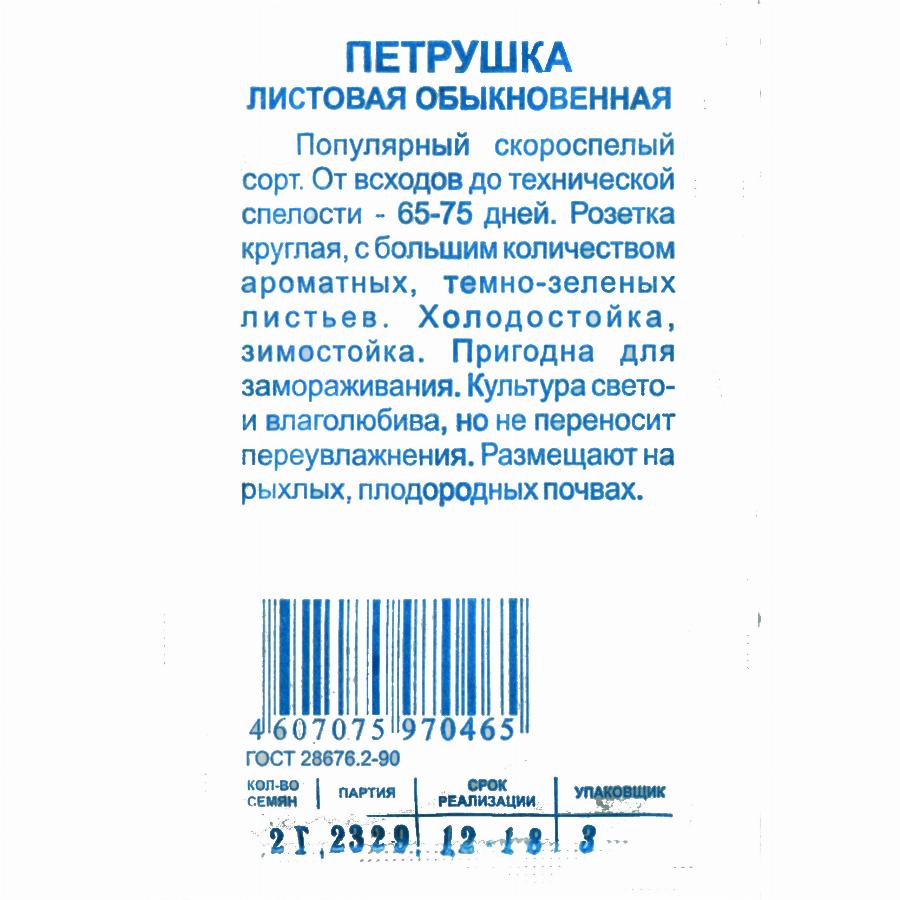 Среднеспелый сорт петрушки. Период от полных всходов до срезки листьев 65-75 дней. Имеет крупную розетку 50 см и больше. Число листьев от 40-100. Отличается обильной листовой массой, скороспелостью, сильной ароматичностью.
