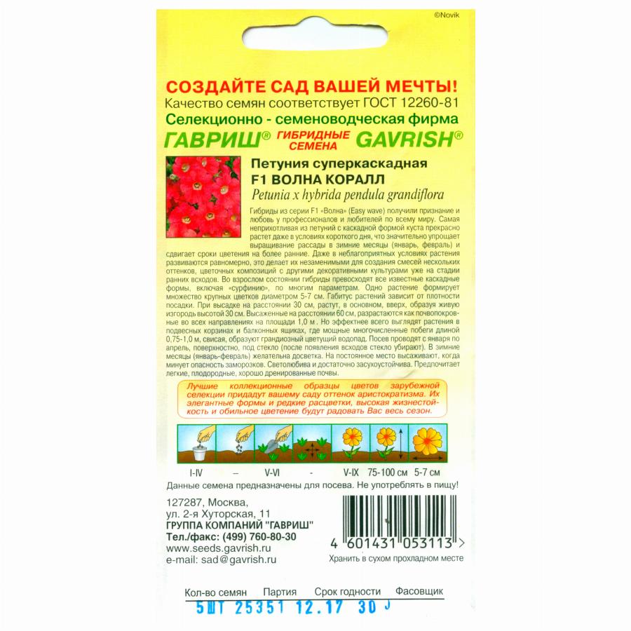 ПЕТУНИЯ СУПЕРКАСКАДНАЯ F1 ВОЛНА КОРАЛЛ 5 ШТ гавриш