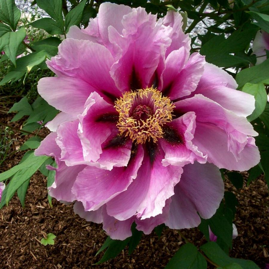 Плотный, коренастый и медленнорастущий кустарник высотой до 1,5 – 2 метров. Листья пиона жесткие, орнаментальные, разделены на узкие доли. Цветки исключительной красоты до 25 см в диаметре розового цвета. Используют, как правило, в качестве солитера, незаменим и при оформлении садов в японском стиле и в духе фэн-шуй. Размножение проводят делением куста или отводками. Уход состоит в своевременном поливе, регулярном рыхлении почвы и внесении калийно-фосфорных удобрений перед цветением. На зиму основание куста утепляют сухой листвой, а сам куст желательно укрыть лапником или современными укрывными материалами. Укрытие необходимо и во время поздних весенних заморозков. При правильном уходе продолжительность жизни этого прекрасного растения практически неограниченна и может составлять более ста лет.