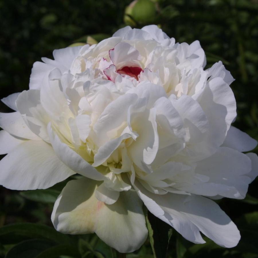 Цветок диаметром 20 см, плотный, чисто-белый, в центре на кончиках лепестков метки красного. Цветение обильное, продолжительное, ранний, с прекрасным ароматом, отметивший недавно свое 150-летие. Высота 100-110 см.