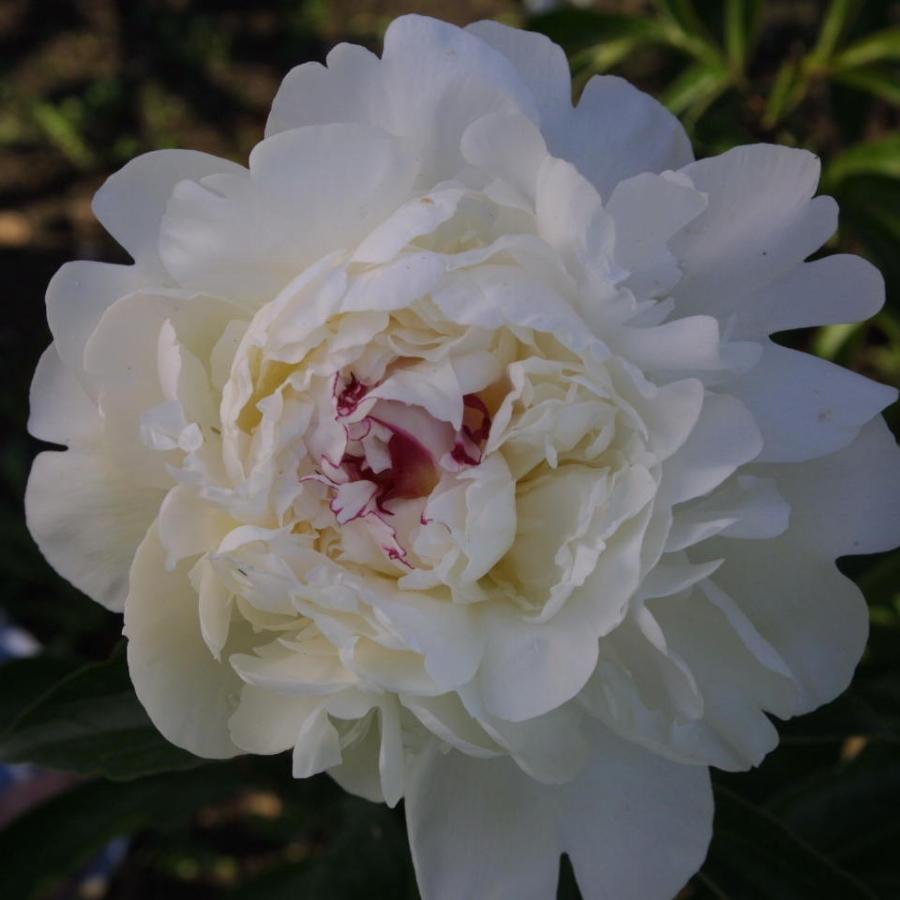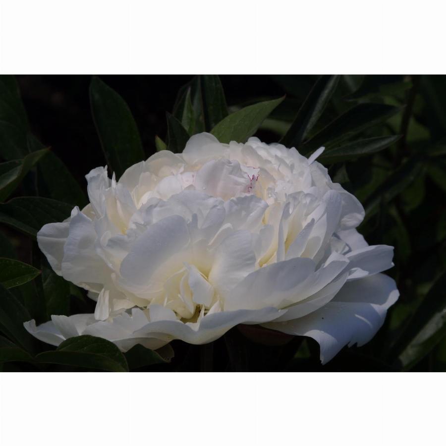 Цветок диаметром 20 см, плотный, чисто-белый, в центре на кончиках лепестков метки красного. Цветение обильное, продолжительное, ранний, с прекрасным ароматом, отметивший недавно свое 150-летие. Высота 100-110 см.