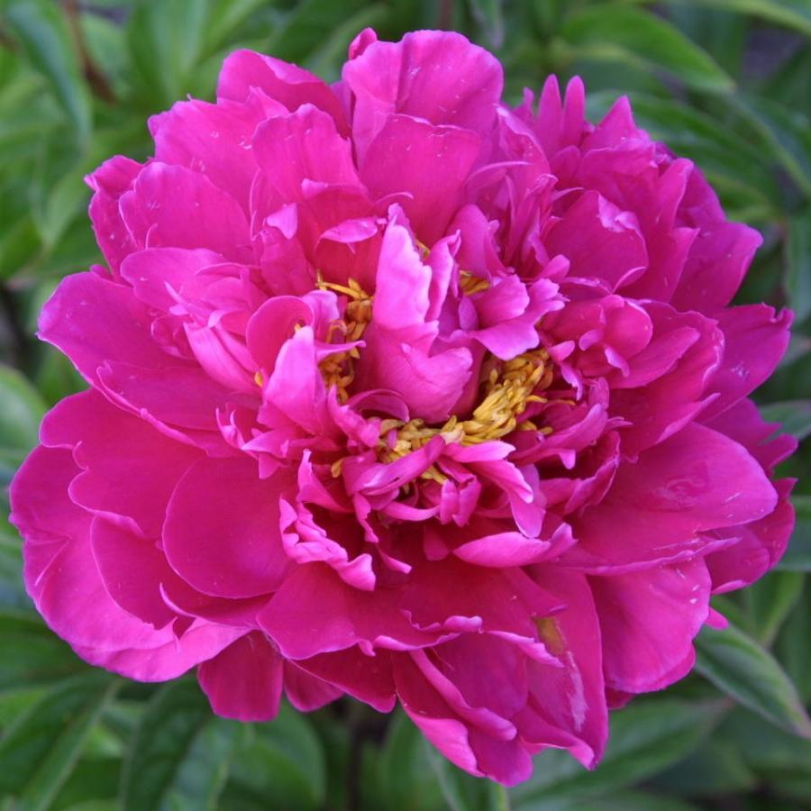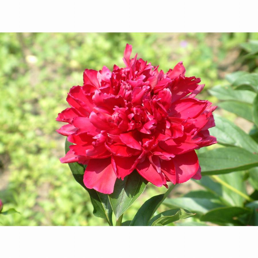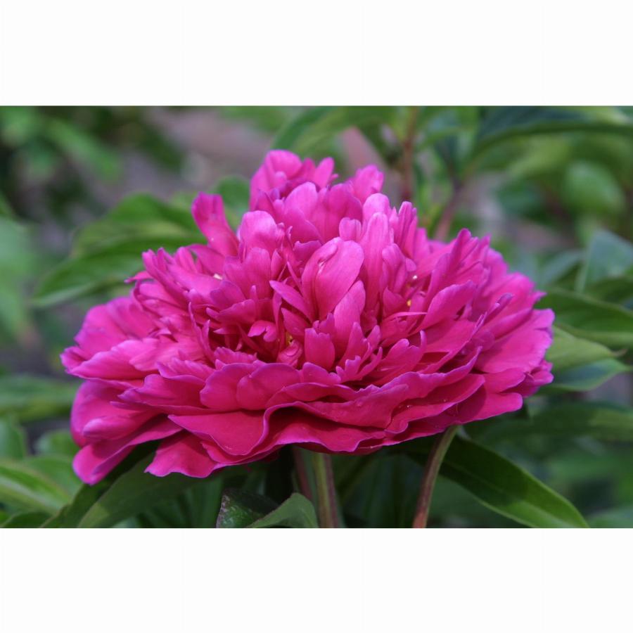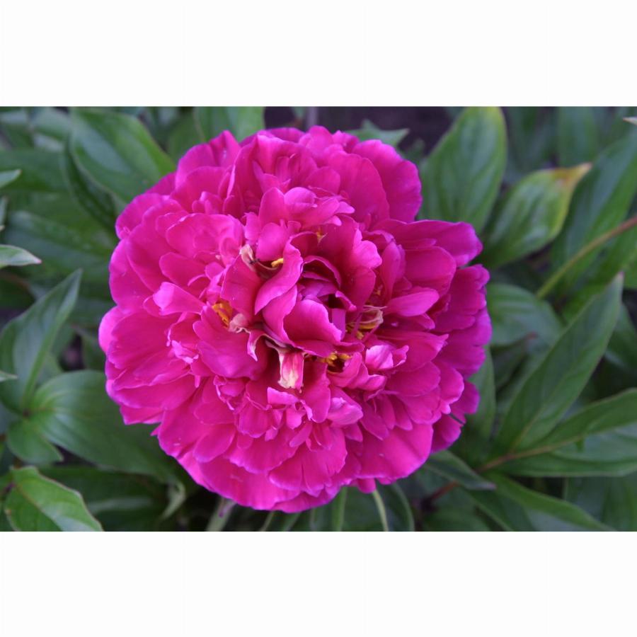 Тёмно-рубиновый с синеватым оттенком, тычинки тёмно-зелёные. Цветок махровый, розовидный, до 12 см диаметром. Среднего срока цветения.