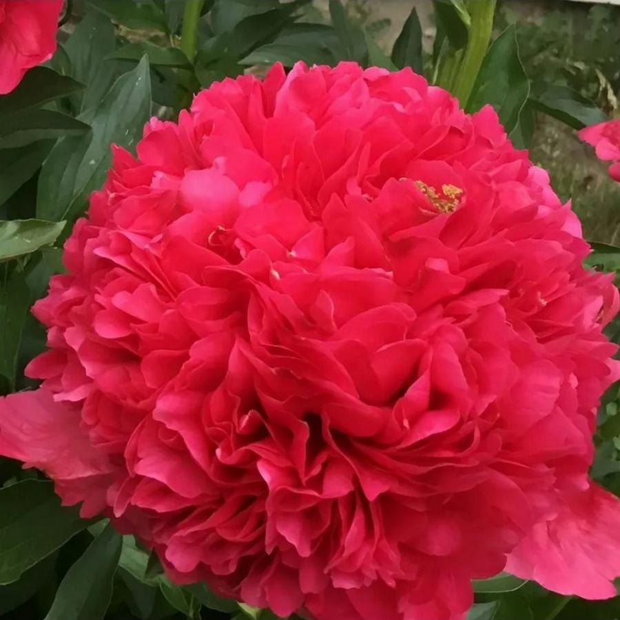 Куст высокий, густой и компактный. Сохраняет зеленую массу до наступления морозов. Высота – 65-85 см. Стебли прочные, зеленые, пряморастущие, заканчиваются одним цветком. Не поникают, опора не требуется. Листья крупные, рассеченные, глянцевые, очередные, формируются по всей длине цветоноса. Цветки махровые, крупные – 25-30 см в диаметре, форма шаровидная, окрас насыщенный бордовый с малиновым оттенком. Лепестки округлые, уменьшаются по размеру к полузакрытой сердцевине.
