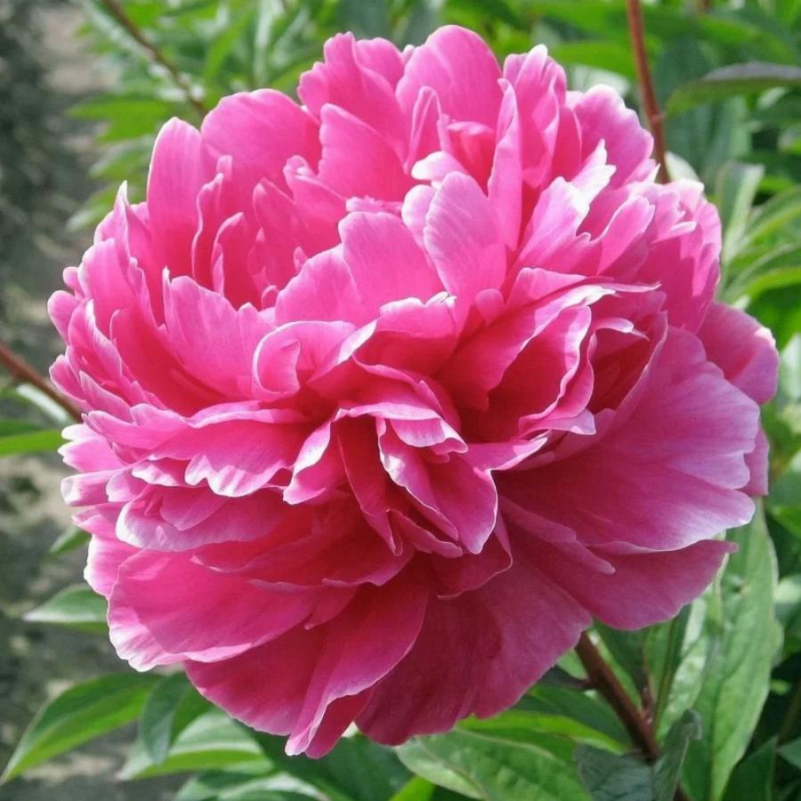 Махровый-полумахровый. Цветок большой, розовый, хорошо сформированный. Лепестки у основания более тёмные. Срок цветения поздний. Высота 90 см.