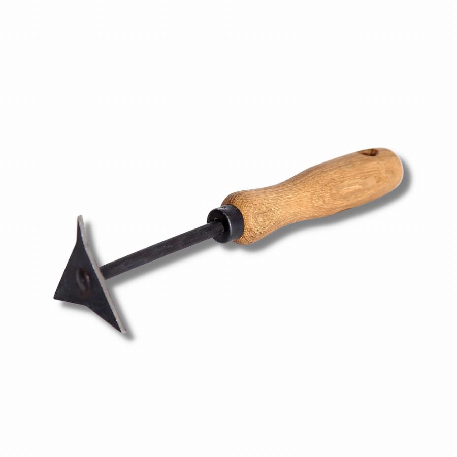 СКРЕБОК для брусчатки ТМ «Tornadica» имеет на концах рабочей поверхности три угла заточки, что позволяет удалять сорняки и мох между плитками различных садовых дорожек. Инструмент выкован вручную из закаленной стали. Рукоятка изготовлена из дуба.