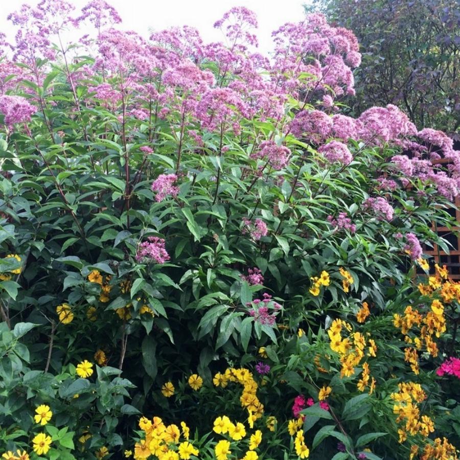 Стебли сорта посконника Атропурпуреум темно-пурпурного цвета (иногда даже пятнистые), а раскрывшиеся трубчатые цветки очень яркие, розовато-лиловые. Они собраны в обширные соцветия диаметром 25 см. Средняя высота побегов – 1,7 м, ширина куста – около 1,5 м. Морозостоййкость до -29°С.