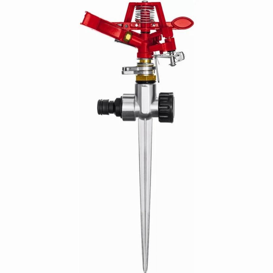 Металлический импульсный распылитель используется для орошения дачного или садового участка. Изготовлен из металла, благодаря чему отличается прочностью и устойчивостью к повреждениям. в почву при помощи пластиковой пики. Предусмотрен щадящий режим для полива чувствительных растений. Конструкция позволяет создать цепочку из нескольких распылителей.