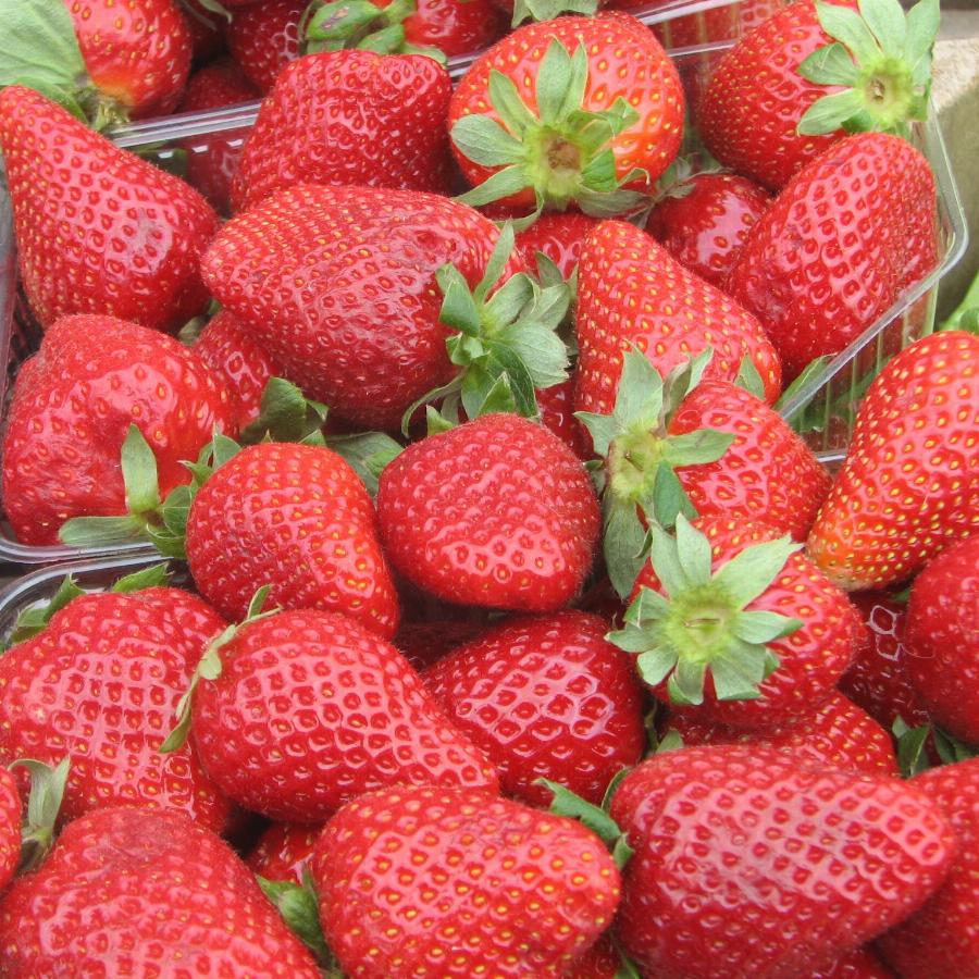 В год высадки урожай имеют от начала августа до поздней осени, в следующем году первый пик плодоношения — как у среднеспелых сортов (на 4–6 день), второй — от начала августа до поздней осени. Ягоды — большие и очень большие, красно-розовые, с сильным блеском. Цвет уровнен по всей поверхности. Мякоть — светло-красная, слабо ароматная, кисло-сладкого вкуса.