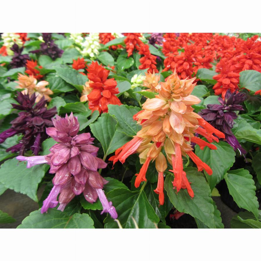 Полукустарник или многолетнее травянистое растение, выращиваемое как однолетнее, 20-80 см высотой. Побеги четырехгранные, светло-зеленые. Кусты обратнояйцевидной формы, густо облиственные, компактные. Листья цельные, расположены супротивно, яйцевидные, заостренные, на черешках, темно-зеленые с верхней стороны и светло-зеленые с нижней. Цветки в мутовках по 2-6, крупные, неправильные, с двойным околоцветником, собраны в кистевидные соцветия 14-25 см длиной. Венчик и чашечка огненно-красные, реже белые, розовые, фиолетовые. Цветет обильно с июня до первых осенних заморозков.