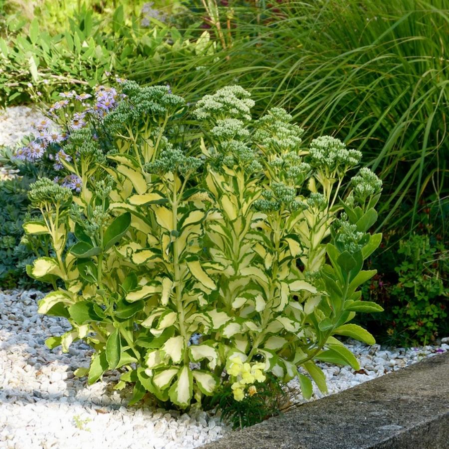 Травянистьый многолетник с сферической кроной, высотой 0,4-0,5 м. Листья мясистые, светло-зелёные с крупным кремово-белым пятном в центре. Цветки звёздчатые, белые с розовым центром, мелкие, в щитковидных соцветиях. Цветение: август-сентябрь. Засухоустойчивое. Светолюбивое. Предпочитает песчаные, водопроницаемые почвы. Зимостойкое , до -34 С.