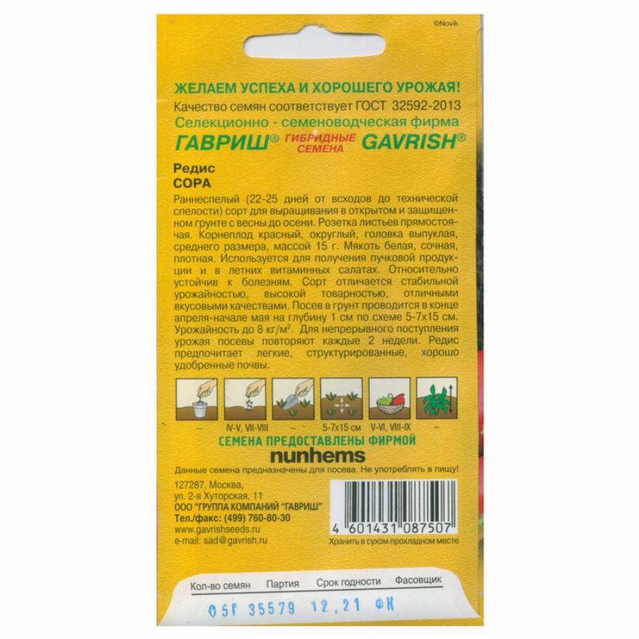 Раннеспелый (22-25 дней от всходов до технической спелости) сорт для выращивания в открытом и защищенном грунте с весны до осени. Розетка листьевпрямостоячая. Корнеплод красный, округлый, головка выпуклая, среднего размера, массой 15 г. Мякоть белая, сочная, плотная. Используется для получения пучковой продукции и в летних витаминных салатах. Относительно устойчив к болезням. Сорт отличается стабильной урожайностью, высокой товарностью, отличными вкусовыми качествами. Посев в грунт проводится в конце апреля — начале мая на глубину 1 см по схеме 5-7х15 см. Урожайность до 8 кг/кв.м. Для непрерывного поступления урожая посевы повторяют каждые 2 недели. Редис предпочитает легкие, структурированные, хорошо удобренные почвы.