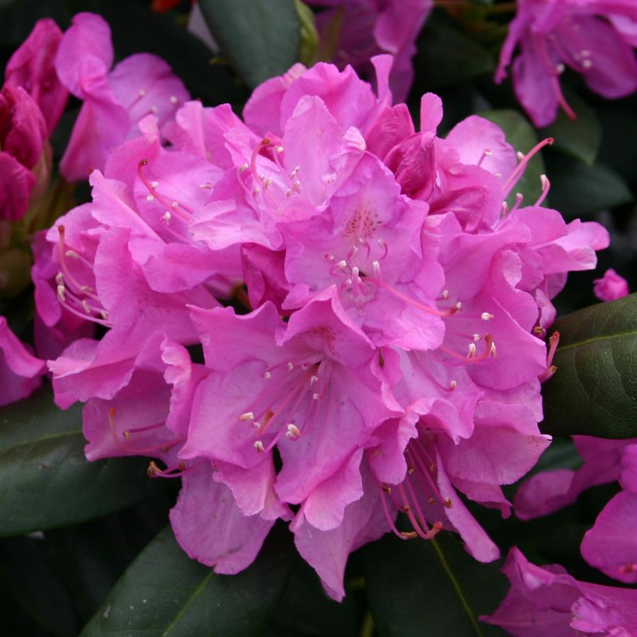 Вечнозеленый, сильнорослый кустарник до 3 м. высотой. Ежегодный прирост до 15 см. Крона широкоокруглая, снизу закрытая. Листья кожистые, овальные или узкоэллиптические, блестящие, 7 — 8 см длиной, 5 — б см шириной, при распускании часто красновато-коричневые, затем темно-зеленые. Цветки розовые с красновато-коричневым пятном, 7 см в диаметре, широковоронковидные, собраны в соцветия до 15 цветков, лепестки по краю слегка волнистые. Цветет в июне. Зимостоек при условии посадки растений в защищенные от ветра места. Выдерживает морозы до -27 0С. Высаживают одиночно на газоне, группами на фоне хвойных или лиственных деревьев. В культуре живет долго, предпочитает плодородные, слабокислые почвы, выносит небольшое затенение.