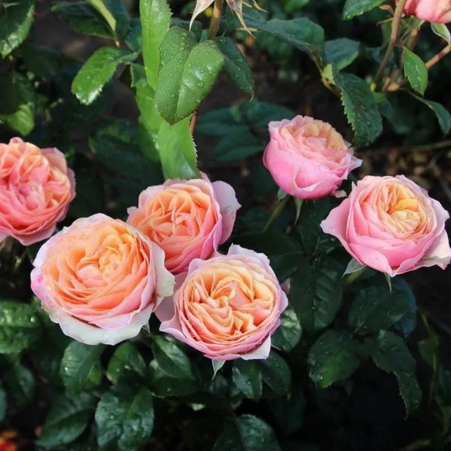Высота 50-60 см. Морозостойкость до (-23°С). Прдолжительное и повторное цветение. Необычная двухцветная роза с оттенками абрикоса, старого золота и желтого цвета центра цветка, обрамленного ореолом нежно розовых внешних лепестков. Цветки крупные, размером от 10-11 см, густомахровые, 87 лепестков, собранных в форме чашевидной розетки персиково-желтой окраски. В грунте окраска цветка меняется, летом на яркий неравномерный розово-лососевый цвет с разными оттенками. Аромат сильный и сладкий, фруктовый с оттенками мирры.