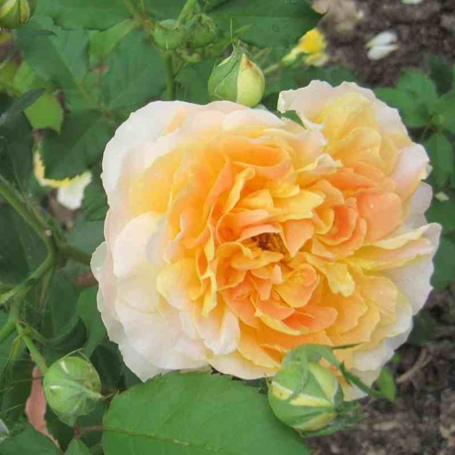 Английская кустовая роза, высота до 80см , ширина куста до 60см. Цветы махровые, желтого цвета, шаровидные, в диаметре до 7,,8см. Образует густой невысокий куст с множеством бутонов, шипов мало.