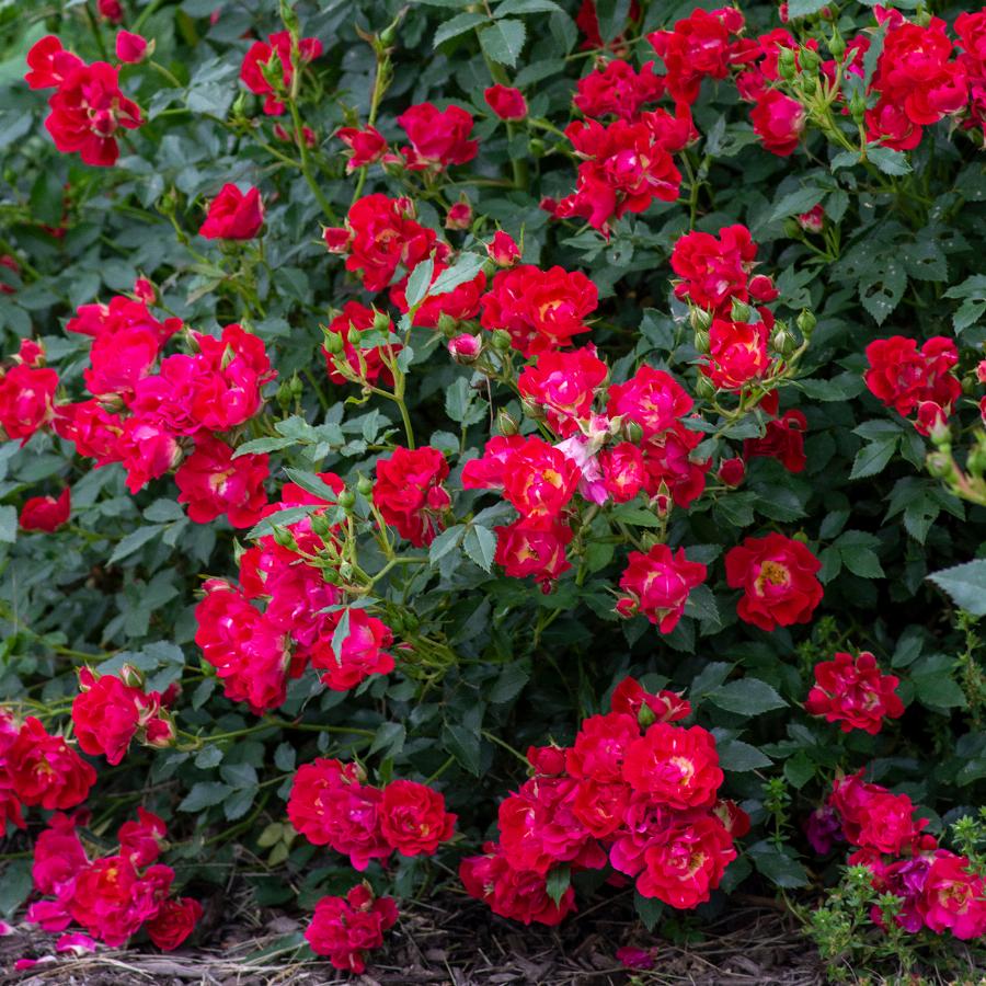 Эта компактная почвопокровная роза. Высотой 30-40 см и шириной 70 см. Хорошо подходит для посадки в балконные ящики и в рокарии. Сорт очень выносливый, устойчивый к болезням, и цветет практически непрерывно все лето. Цветки красные с желтым основанием. Листва мелкая, очень густая.
