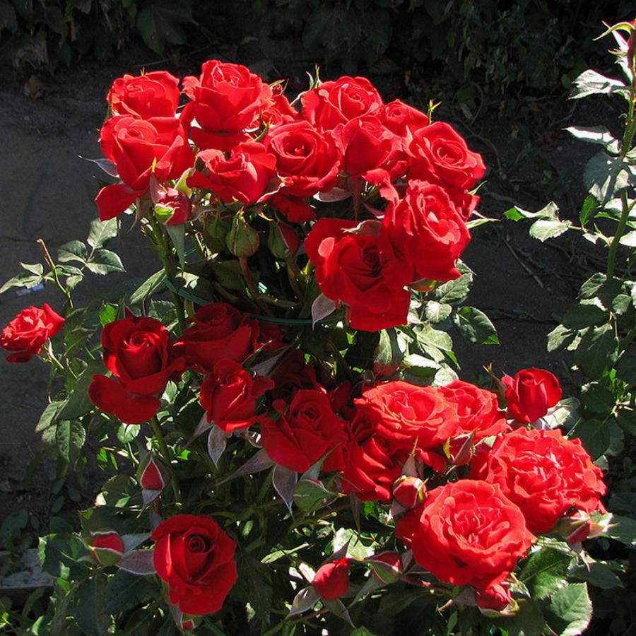Высота 80-90см. Классические красные бутоны в соцветиях на прямостоячем компактном кусте. Кол-во цветков на стебле 3-5. Есть легкий аромат. Устойчивость к мучнистой росе и к черной пятнистости средняя. Повторна цветущая. Морозостойкость до -23°С.