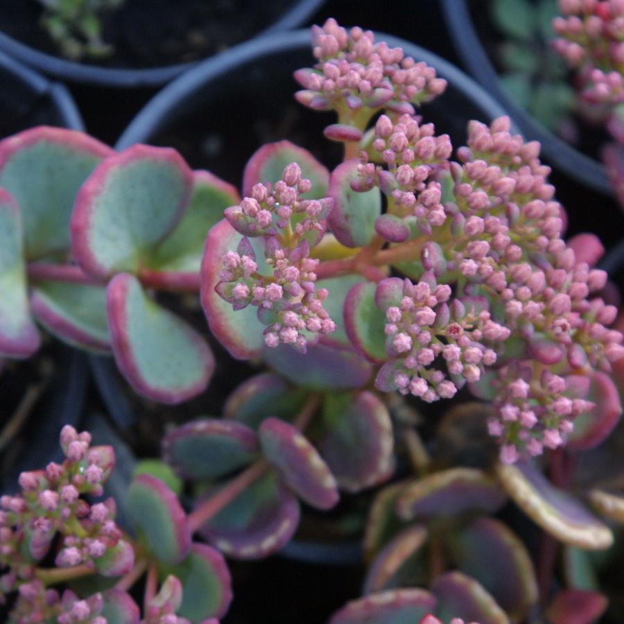 Многолетнее декоративное растение высотой 15-20 см. Голые, ползучие стебли красноватого цвета образуют густые низкие ковровые заросли. Листья сидячие, округлые, зубчатые, сизо-голубоватые, по краю красноватые. Собраны в мутовки по три. Соцветия — верхушечные, зонтиковидно-щитковидные метелки, диаметром 2-4 см; прицветники яйцевидные. Цветоножки 3-5 мм. Цветки диаметром около 1,3 см. Лепестки розовые, продолговато-ланцетные, 4-5 х 2 мм, на верхушке острые; супротивные чашелистикам тычинки длиннее, чем лепестки, а супротивные лепесткам примерно равны их длине; пыльники желтые. Нектарные железки продолговатые, лопатовидные, длиной 0,8 мм, на верхушке усеченные или почти окаймленные, плодолистики прямые, узкояйцевидные, длиной 2,5-3 мм. Стилодии 1,5 мм.