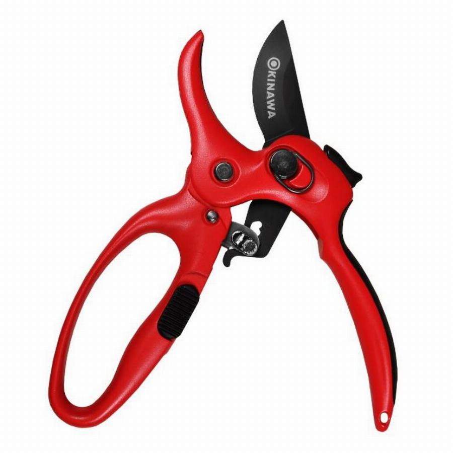 2349 OKINAWA Cекатор храповый с гардой — рекомендован для обработки живых веток любого типа диаметром до 18 миллиметров. Прочный корпус из алюминиевого сплава увеличивает срок службы инструмента Храповый механизм позволяет сократить усилие при более стабильном и равномерном резе. Съёмная подушка для очистки и смазывания лезвия установлена в верхней части рукоятки. Лезвие из стали SK5 имеет тефлоновое покрытие. Рекомендован для обработки живых веток любого типа диаметром до 24 миллиметров.