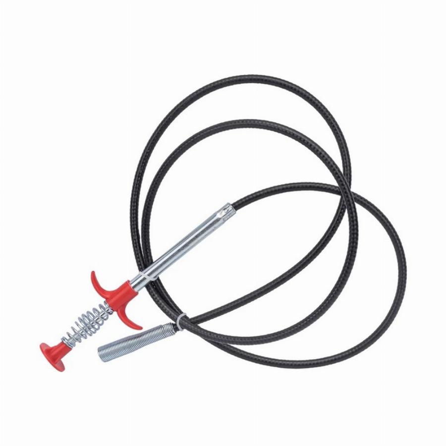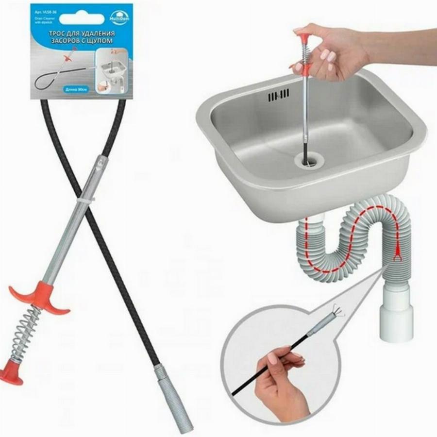 На конце троса находится щуп, который позволит без труда захватить источник засора и беспрепятственно его удалить из трубы. Для этого достаточно нажать на пружину вверху троса, щуп выдвинется и раскроется на другом конце. Подцепите засор и отпустите пружину, щуп сомкнется, зажав вылавливаемый предмет.