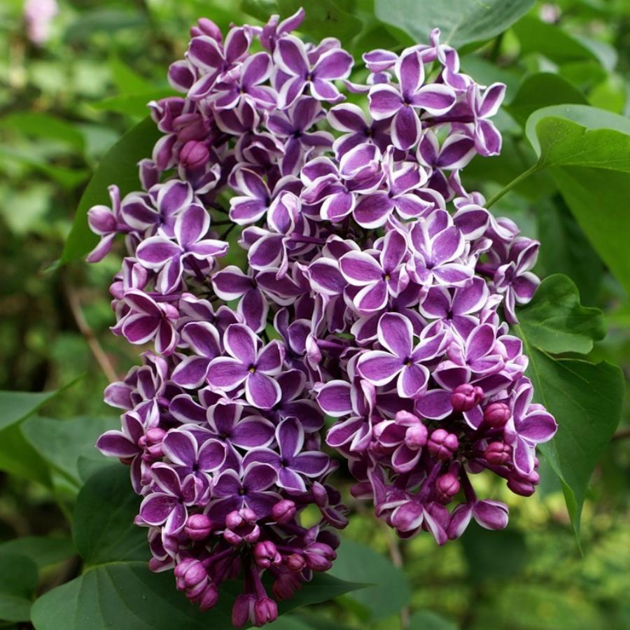 Цветы пурпурно-красные, с серебристо-белой широкой каймой по краям, крупные 2,2 см в диаметре, простые, слегка душистые. Лепестки широкие, выпукло-вогнутые. Соцветия из 1-2 пар узкопирамидальных метелок (18Х8см) средней плотности с выступающими отверстиями.Листья темно-зеленые. Кусты сильнорослые. Цветет умерено, в поздние сроки. Применяется для выгонки. Очень оригинальный сорт благодаря белому окаймлению на лепестках цветов.