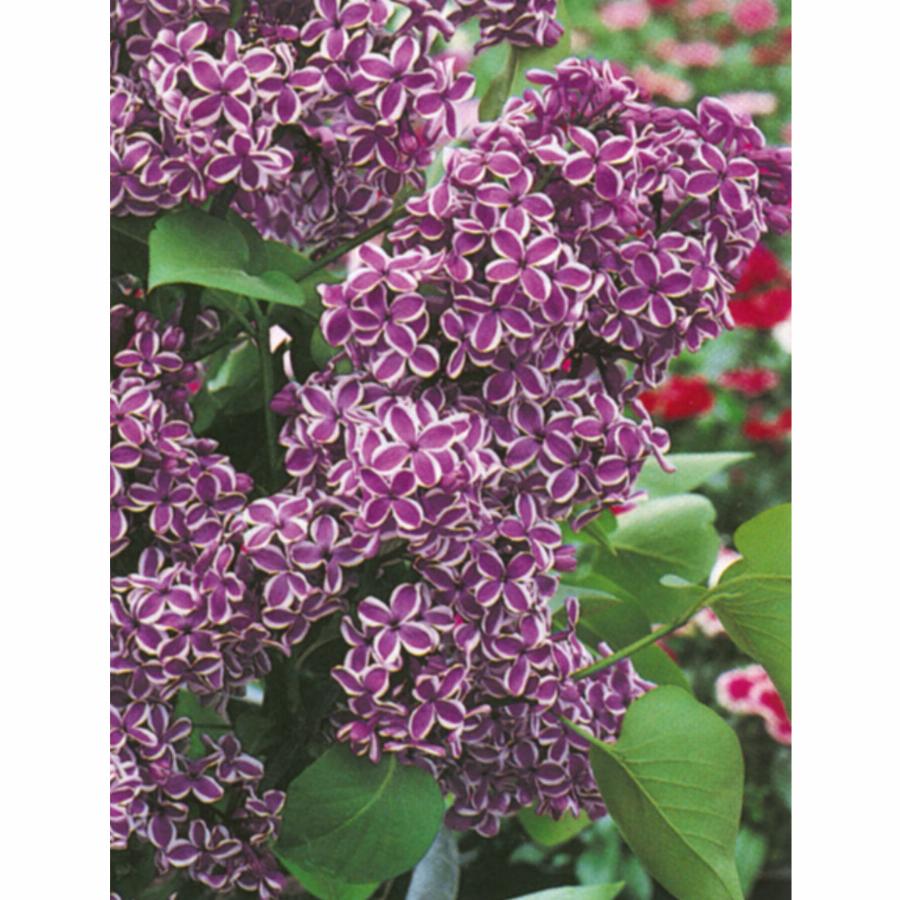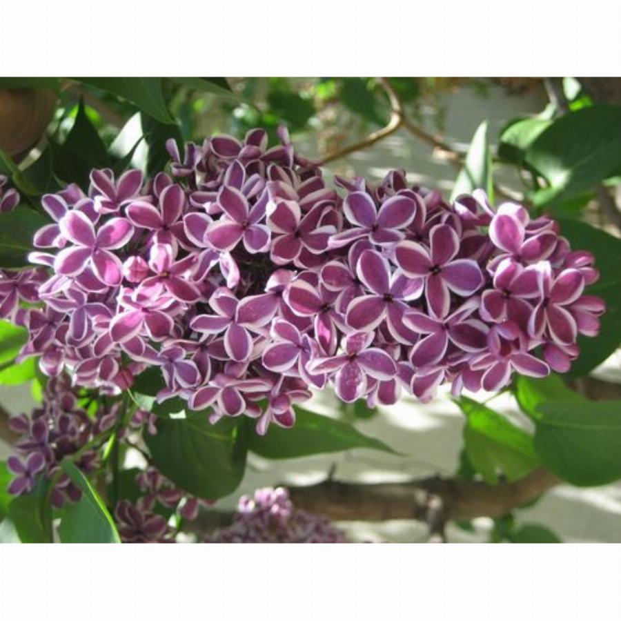 Цветы пурпурно-красные, с серебристо-белой широкой каймой по краям, крупные 2,2 см в диаметре, простые, слегка душистые. Лепестки широкие, выпукло-вогнутые. Соцветия из 1-2 пар узкопирамидальных метелок (18Х8см) средней плотности с выступающими отверстиями.Листья темно-зеленые. Кусты сильнорослые. Цветет умерено, в поздние сроки. Применяется для выгонки. Очень оригинальный сорт благодаря белому окаймлению на лепестках цветов.