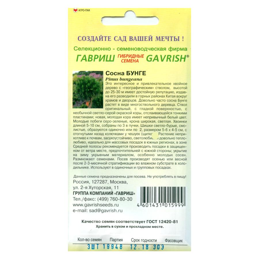 Это интересное и привлекательное хвойное дерево с «геграфическим» стволом, высотой до 25-30 м имеет достойную репутацию, издавна его разводили в горных районах Китая вокруг храмов и дворцов. Довольно часто сосна Бунге растет в виде многоствольного деревца. Ствол оригинальный, с гладкой поверхностью, с необычной светло-серой окраской коры, отслаивающейся тонкими пластинами; новая, молодая кора имеет непривычный белый цвет. Молодые побеги серо-зеленые, крона широкая, светлая. Хвоинки длиной 5-10 см, собраны по 3 в пучки. Шишки светло-бурые, смолистые, образуются одиночно или по 2, размером 5-6 х 4-5 см, с отогнутыми назад колючками у чешуек (щитков). Растение неприхотливо к почвам, засухоустойчиво, светолюбиво и довольно теплолюбиво, идеально для массовых посадок в южных регионах, в зоне Средней полосы рекомендуется производить посадки в защищенном от ветра месте, предпочтительней с южной стороны; укрытие на зиму укрывным материалом, особенно молодых сосен. Размножают семенами. Посев производят осенью или весной после 2-3-месячной стратификации во влажном субстрате в холодильнике. Используют в одиночных и групповых посадках.