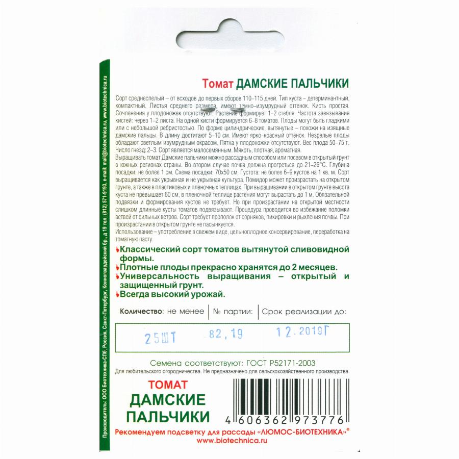 Сорт среднеспелый – от всходов до первых сборов 110-115 дней. Тип куста — детерминантный, компактный. Листья среднего размера, имеют темно-изумрудный оттенок. Кисть простая. Сочленения у плодоножек отсутствуют. Растение формирует 1-2 стебля. Частота завязывания кистей: через 1-2 листа. На одной кисти формируется 6-8 томатов. Плоды могут быть гладкими или с небольшой ребристостью. По форме цилиндрические, вытянутые – похожи на изящные дамские пальцы. В длину достигают 5-10 см. Имеют ярко-красный оттенок. Незрелые плоды обладают светлым изумрудным окрасом. Пятна у плодоножки отсутствуют. Вес плода 50-75 г. Число гнезд: 2-3. Сорт является малосемянным. Мякоть, плотная, ароматная. Выращивать томат Дамские пальчики можно рассадным способом или посевом в открытый грунт в южных регионах страны. Во втором случае почва должна прогреться до 21-26°С. Глубина посадки: не более 1 см. Схема посадки: 70х50 см. Густота: не более 6-9 кустов на 1 кв. м. Сорт выращивается как укрывная и не укрывная культура. Помидор может произрастать на открытом грунте, а также в пластиковых и пленочных теплицах. При выращивании в открытом грунте высота куста не превышает 60 см, в пленочной теплице растения могут вырастать до 1 м. Обязательной подвязки и формирования кустов не требует. Но при произрастании на открытой местности слишком длинные кусты томатов подвязывают. Процедура проводится во избежание поломки ветвей от сильных ветров. Сорт требует прополок от сорняков, пикировки и рыхления почвы. При произрастании в открытом грунте не пасынкуется. Использование – употребление в свежем виде, цельноплодное консервирование, переработка на томатную пасту. Классический сорт томатов вытянутой сливовидной формы Плотные плоды прекрасно хранятся до 2 месяцев