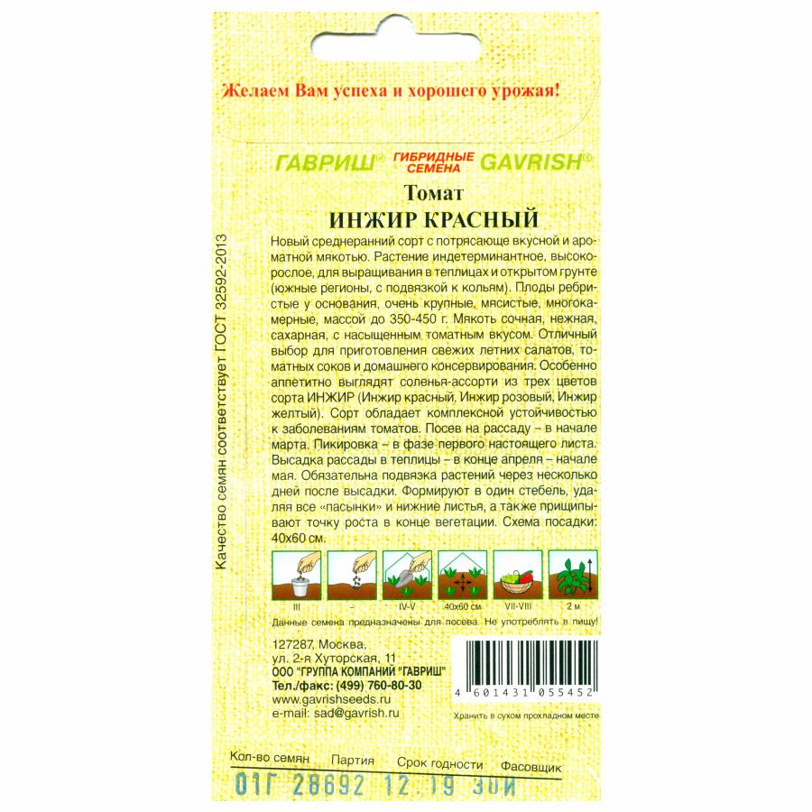 Новый среднеранний сорт с потрясающе вкусной и ароматной мякотью. Растение индетерминантное, высокорослое, для выращивания в теплицах и открытом грунте (южные регионы, с подвязкой к кольям). Плоды ребристые у основания, очень крупные, мясистые, многокамерные, массой до 350-650 г. Мякоть сочная, нежная, сахарная, с насыщенным томатным вкусом. Отличный выбор для приготовления свежих летних салатов, томатных соков и домашнего консервирования. Особенно аппетитно выглядят соленья-ассорти из трех цветов сорта ИНЖИР (Инжир красный, Инжир розовый, Инжир желтый). Сорт обладает комплексной устойчивостью к заболеваниям томатов. Посев на рассаду — в начале марта. Пикировка — в фазе первого настоящего листа. Высадка рассады в теплицы — в конце апреля — начале мая. Обязательна подвязка растений через несколько дней после высадки. Формируют в один стебель, удаляя все «пасынки» и нижние листья, а также прищипывают точку роста в конце вегетации. Схема посадки: 40х60 см.