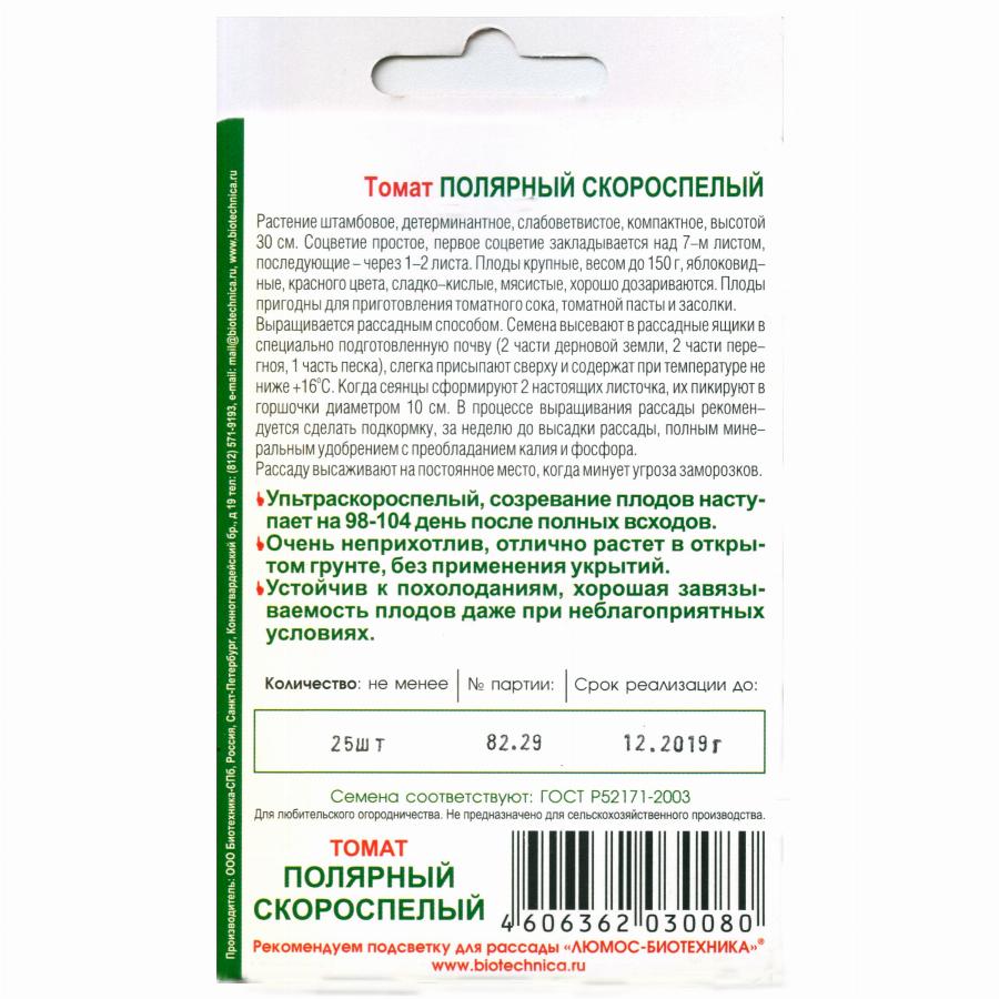 ТОМАТ ПОЛЯРНЫЙ СКОРОСПЕЛЫЙ 25 ШТ биотехника