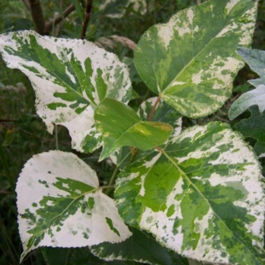 Дерево среднего (до 9 м) размера с широкими, овальными листьями до 10-12 см длиной. Они обильно покрыты кремовыми, розовыми и зелеными пятнами в конце лета.