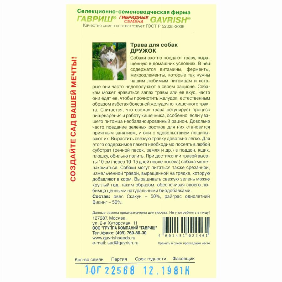 Собаки охотно поедают траву, выращенную в домашних условиях. В ней содержатся витамины, ферменты, микроэлементы, которые так нужны нашим любимым питомцам и которые они часто недополучают в своем рационе. Собакам может нравиться запах травы или ее вкус, часто они едят ее, чтобы прочистить желудок, естесственным образом избегая болезней желудочно-кишечного тракта. Считается, что свежая трава регулирует процесс пищеварения и работу кишечника, особенно, если у вашего питомца несбалансированный рацион. Довольно часто поедание зеленых ростков для них становится приятным занятием, и они с удовольствием пощипывают их. Вырастить свежую травку довольно легко. Для этого содержимое пакета необходимо посеять в любой субстрат (речной песок, земля и др.) в поддон, ящик , плошку, обильно полить. При достижении травой высоты 10 см (через 10-15 дней после посева) собака может лакомиться. Собаки могут питаться также срезанной, измельченной травой, выращенной на грядке, которую добавляют в корм. Выращивать свежую зелень можно круглый год, таким образом, обеспечивая своего любимца ценными натуральными биодобавками. Состав: овес Скакун — 50%, райграс однолетний Викинг — 50%.