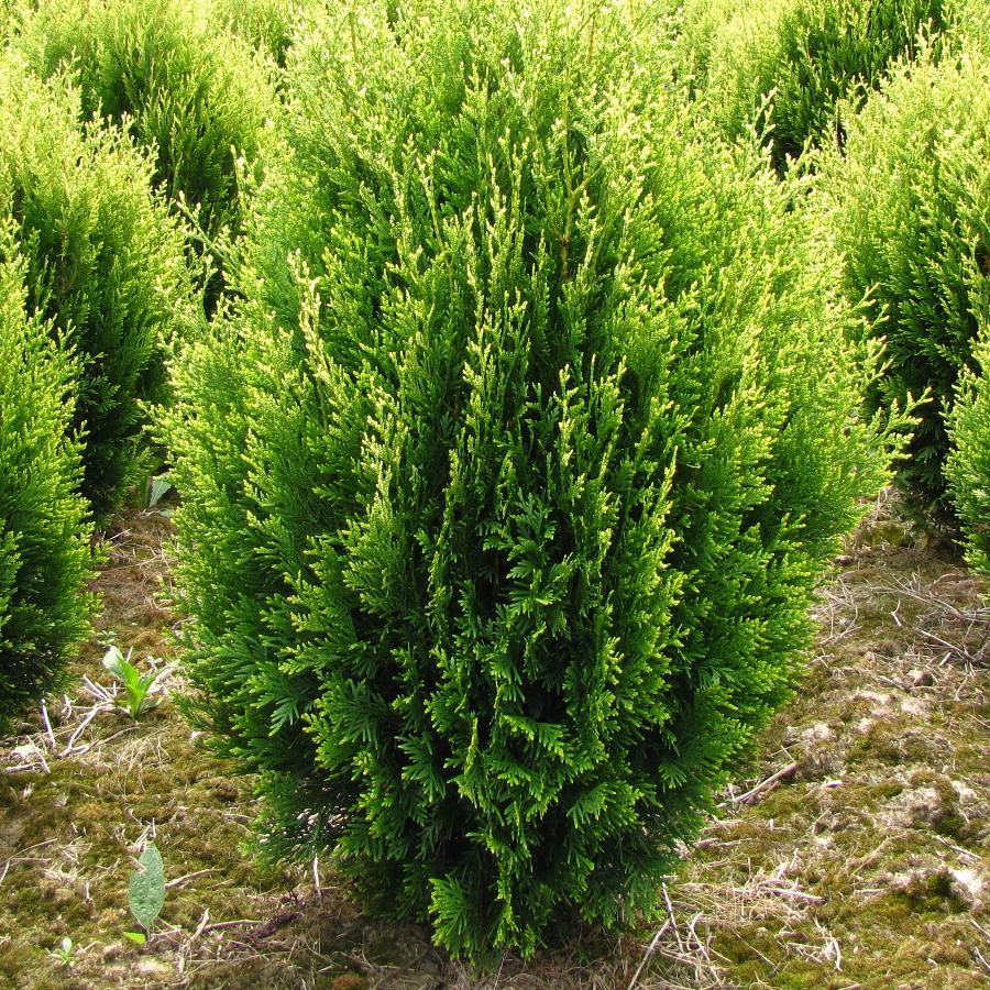 Мощное, долговечное дерево с густой пирамидальной кроной. Ветви горизонтальные, слегка свисающие на концах. Верхняя их сторона зеленая, блестящая, нижняя – с беловатыми полосками. После 10 лет туя достигает 2,5-3м высоты. Хвоя заостренная, ароматная при растирании. Требует довольно плодородной и влажной почвы. Теневынослива. Рекомендуется для живых изгородей и как растение для формирования шпалер. Частота посадки в ряду: через 0,8м.