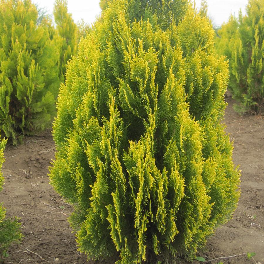 Форма быстрорастущая, в молодом возрасте узкокеглевидная; старое растение у основания достаточно широкое, составляет почти 1/3 высоты, очень плотноветвистое; молодые побеги долгое время золотисто-желтые, позднее становятся зеленовато-желтыми, зимой не коричневеют.