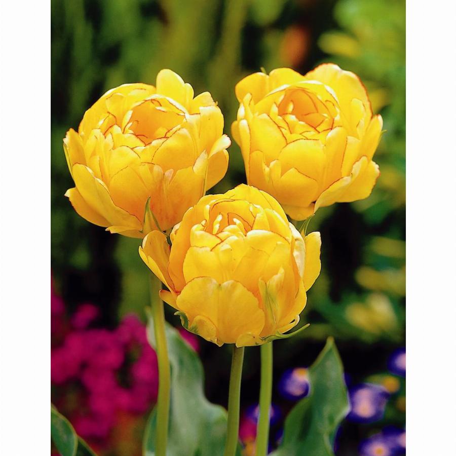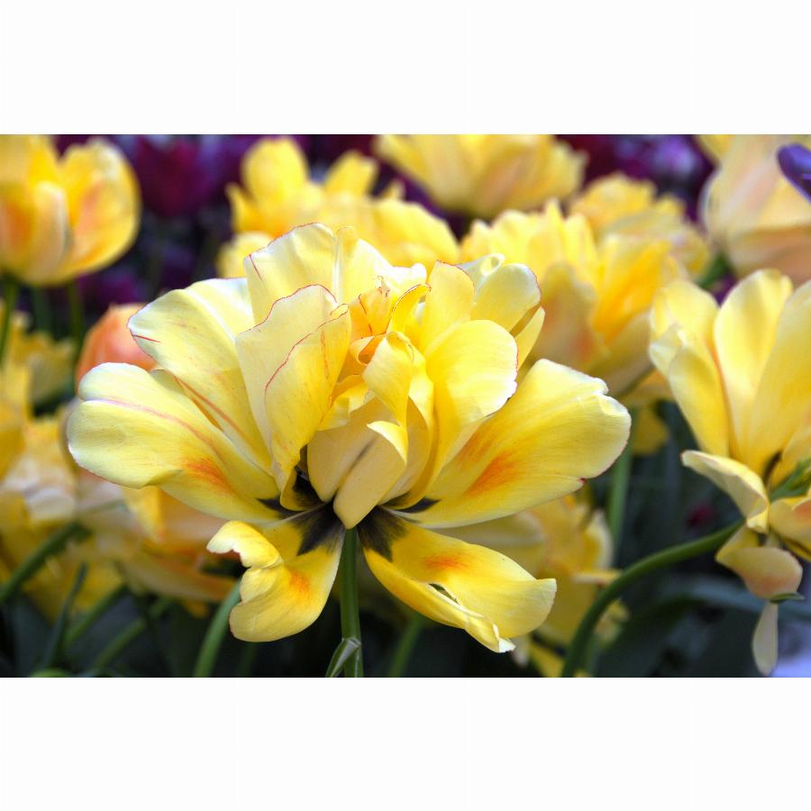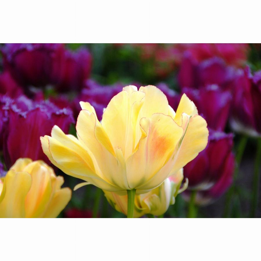 Махровые тюльпаны — цветы этой группы имеют большое количество лепестков. Цветки формой и величиной напоминают густомахровые пионы. Прекрасно смотрятся в букетах. Посадка и уход: Примерно через месяц после цветения листья тюльпанов полегают и усыхают. Именно в этот период вегетативного покоя, т.е. уже в июне, луковицы выкапывают для размножения. Их подсушивают несколько дней в тени и удаляют статки листьев и корни. За сезон каждая материнская луковица дает 1-2 крупные дочерние «детки.» Их аккуратно отделяют и вместе с материнской хранят до осени при комнатной температуре в хорошо проветриваемом помещении. Осенью луковицы высаживают на новое место. Глубина посадки зависит от величины луковицы и должна составлять три ее высоты. Расстояние м/у лунками 10-20 см.