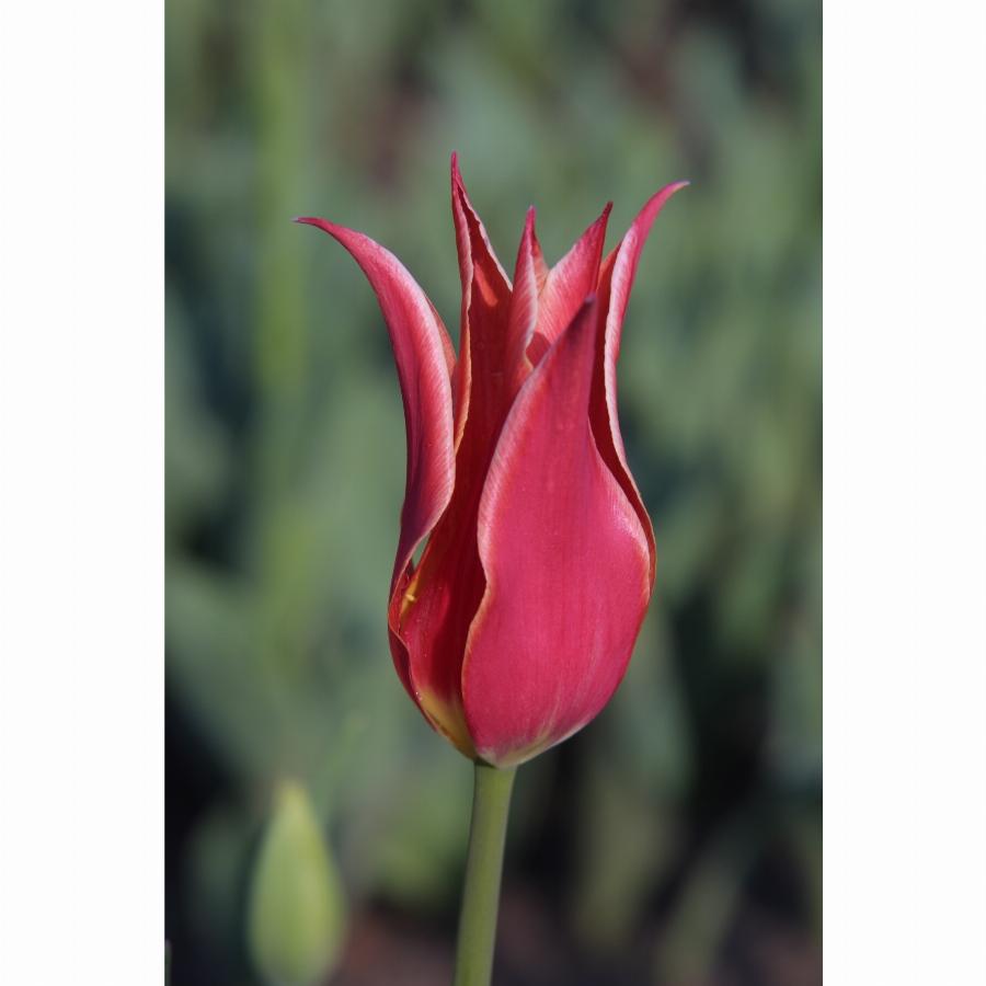Лилиецветный. Цветок изяшной лилейной формы, высотой до 10 см. Окраска карминно-красная с узкой золотистой каймой, бледно-желтая в основании. Дно, пыльники и тычиночные нити светло-желтые. Высота 50 — 65 см.