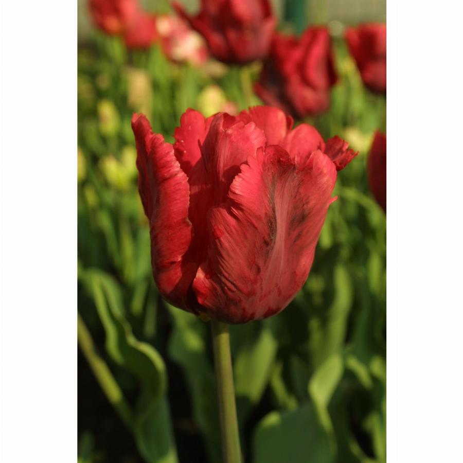 Класс 10. Попугайные тюльпаны. Цветок красный, красивой попугайной формы с разрезаными лепестками. Цветонос стройный и прочный. Пригоден для выгонки с января.