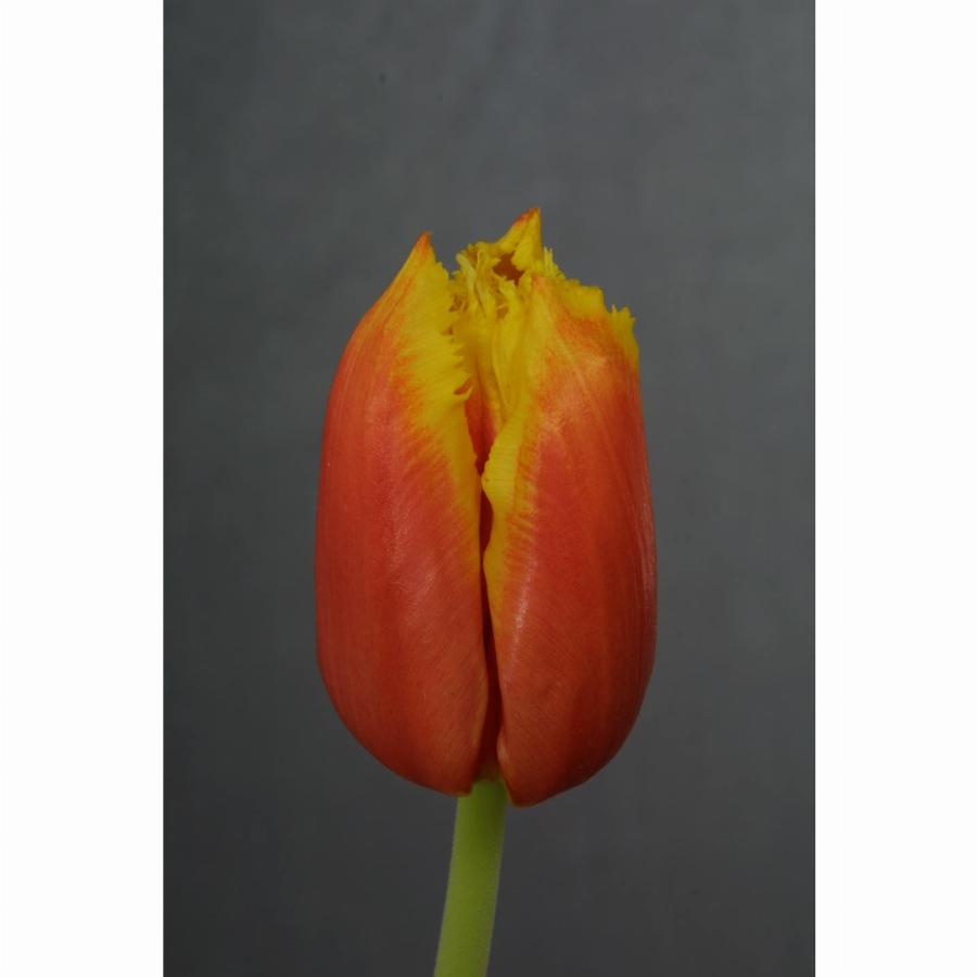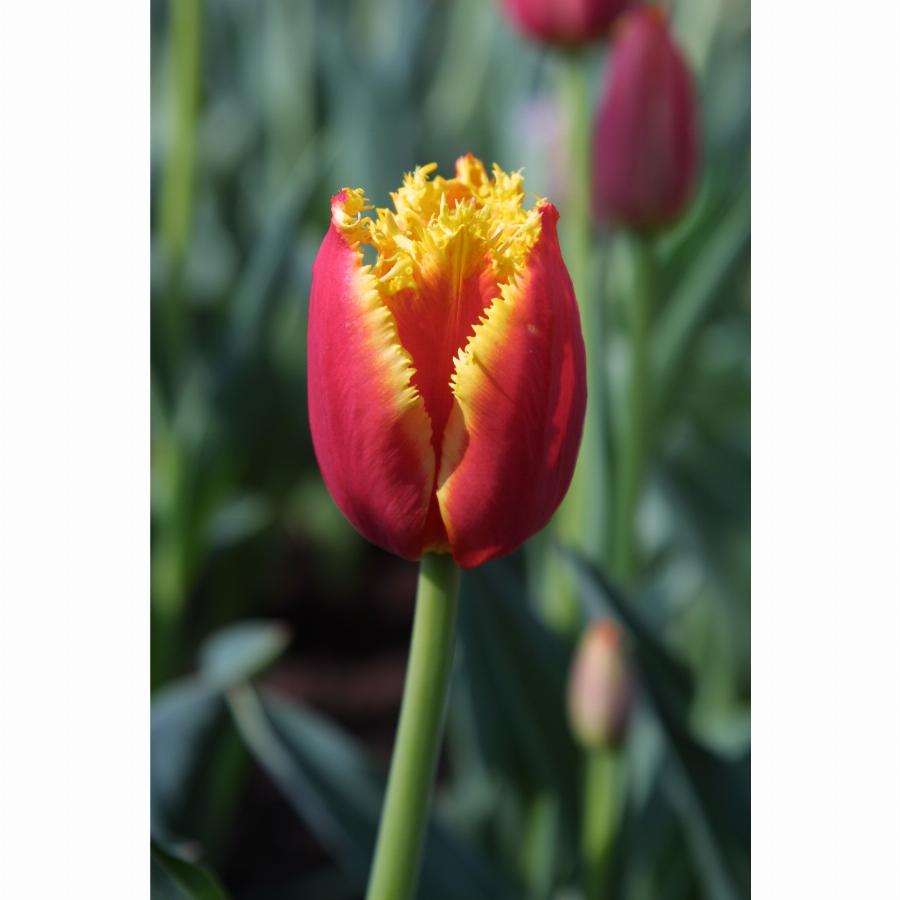 Восокий до 70 см. бахромчатый тюльпан. Ярко-красный с крупной желтой бахромой. Цветонос стройный и прочный. Супер выгонка и срезка.