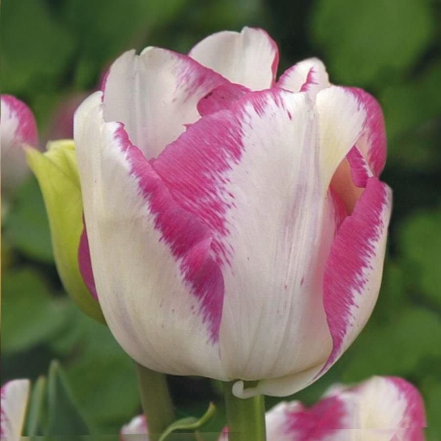 Высота растения 35 см. Окраска цветка белая с малиново-розовыми краями. Цветение: апрель-май.