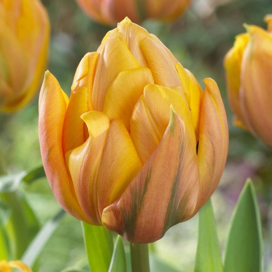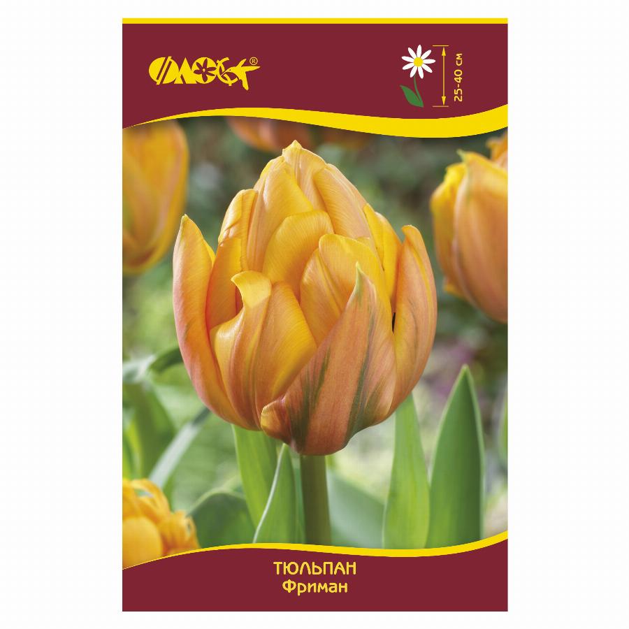 Желто-оранжевые бутоны пионовидной формы. Внешняя сторона лепестков — оранжево-красная, дно бокала желтое. Листья узкие, гофрированные, насыщенно-зеленые.