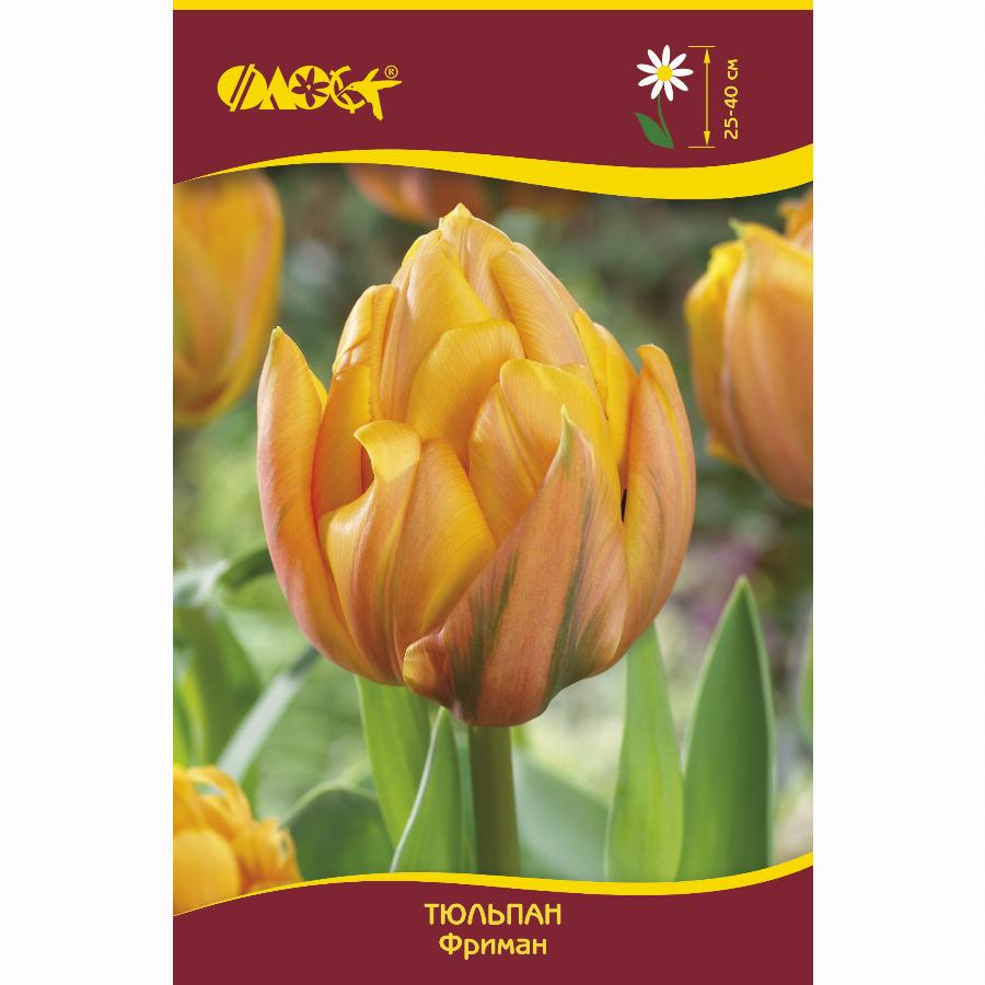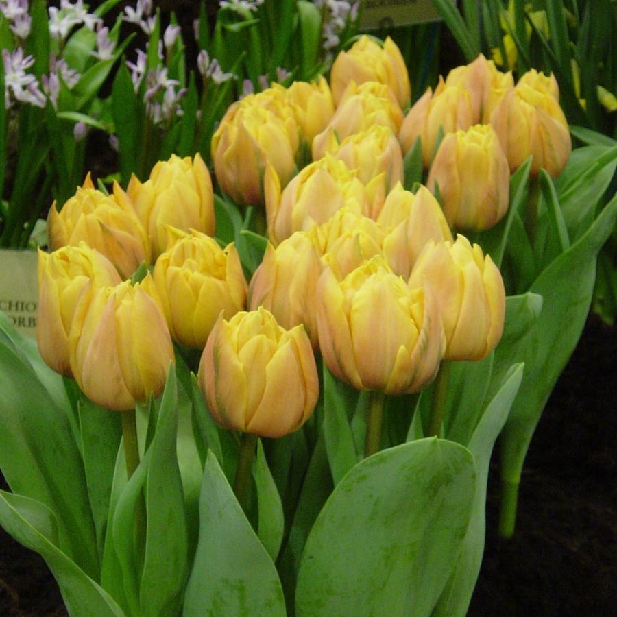 Желто-оранжевые бутоны пионовидной формы. Внешняя сторона лепестков — оранжево-красная, дно бокала желтое. Листья узкие, гофрированные, насыщенно-зеленые.